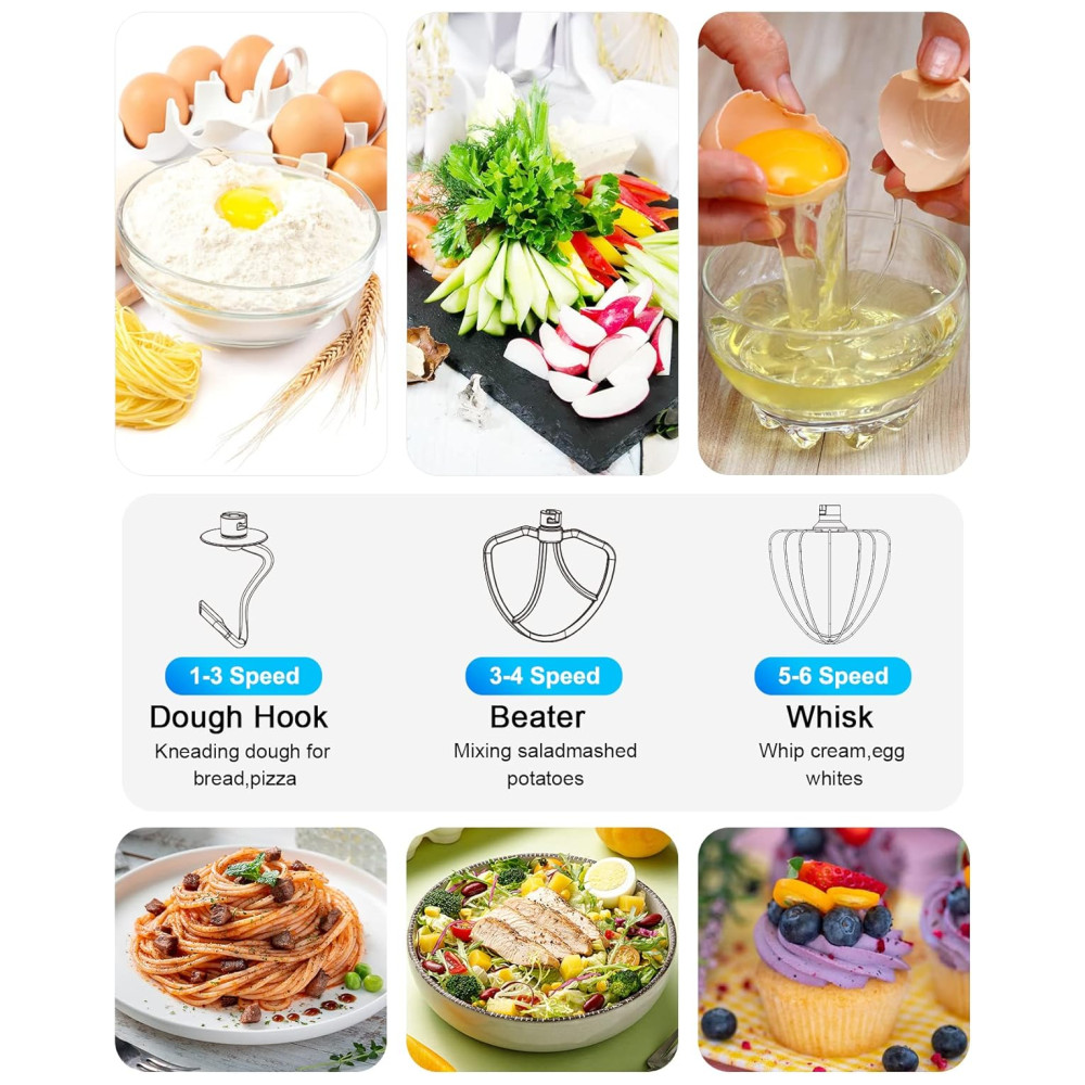 A velocidade de 1 a 3 é ideal para amassar a massa, a velocidade de 2 a 4 para misturar massa de panqueca ou salada e a velocidade de 5 a 6 é perfeita para bater creme ou clara de ovo.