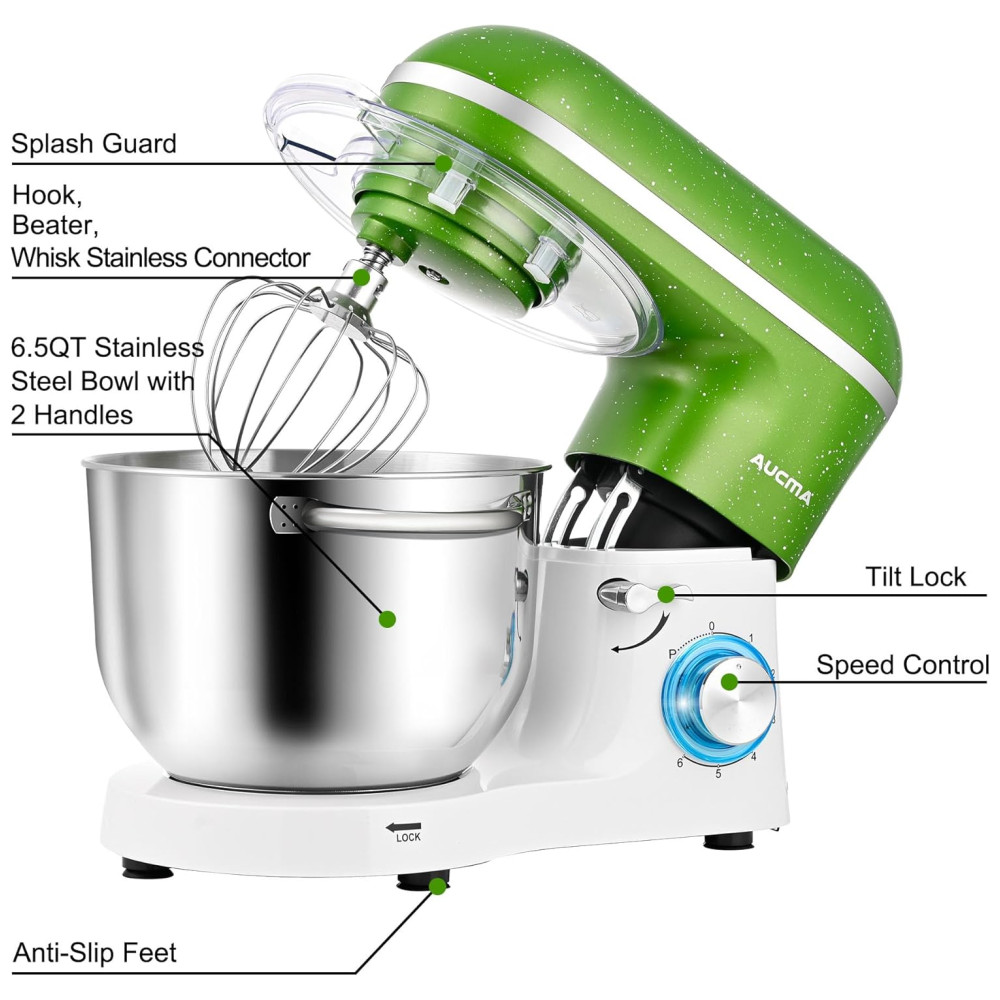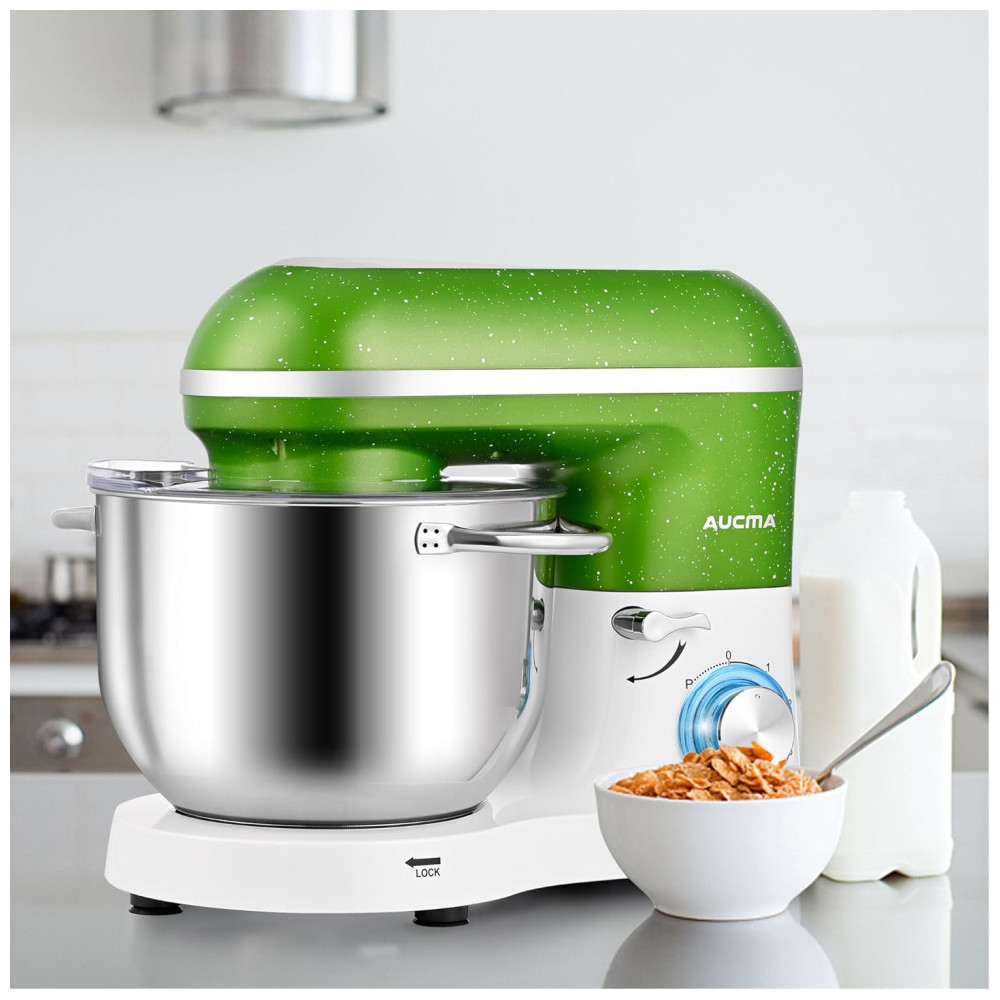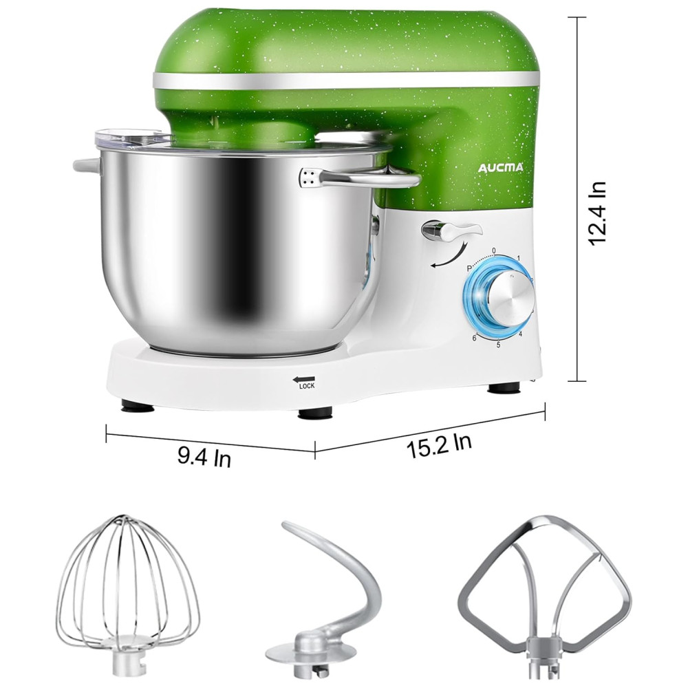 Batedeira Aucma 65Litros 660W 6 Velocidades com Inclinação Mixer de Alimentos de Cozinha com Gancho de Massa Batedor de Arame Verde-Branco.