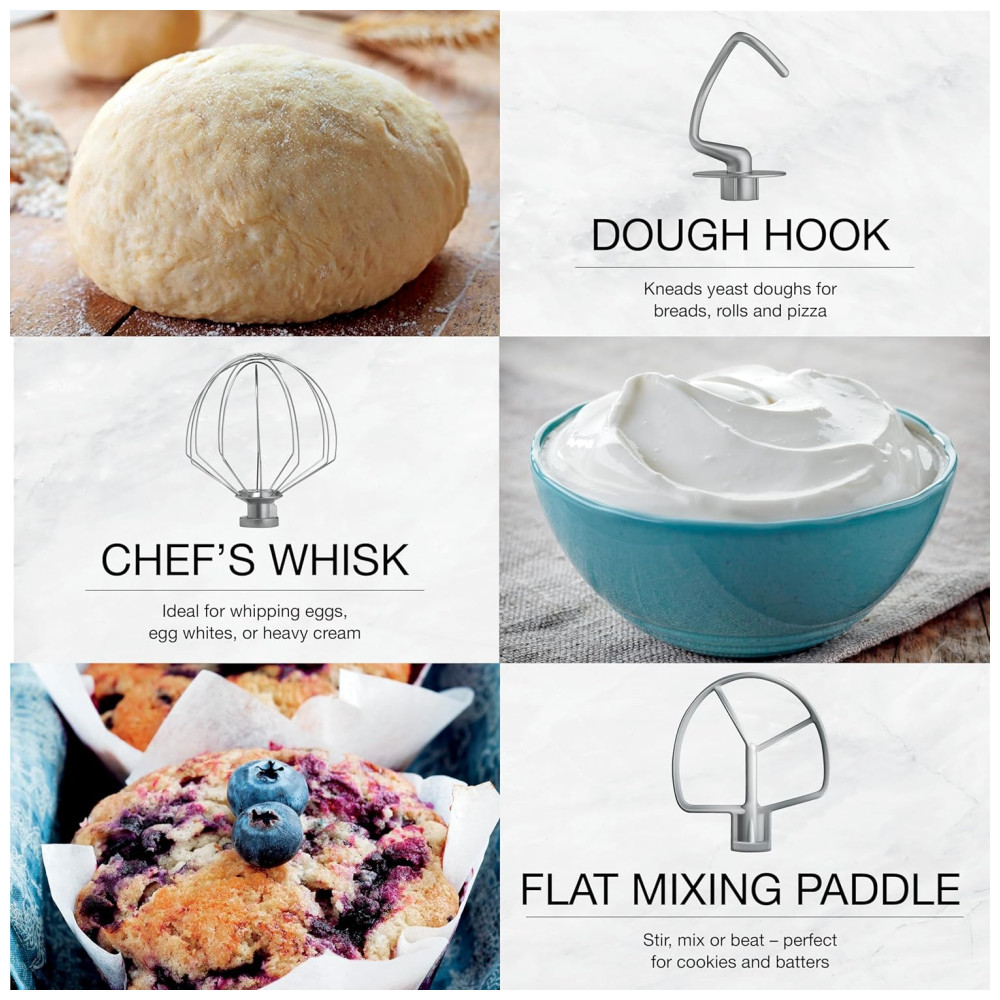 Inclui batedor de cozinha, gancho de massa, pá de mistura plana, protetor de respingos com bico de servir, livreto de instruções e receitas, cabeça inclinada para trás