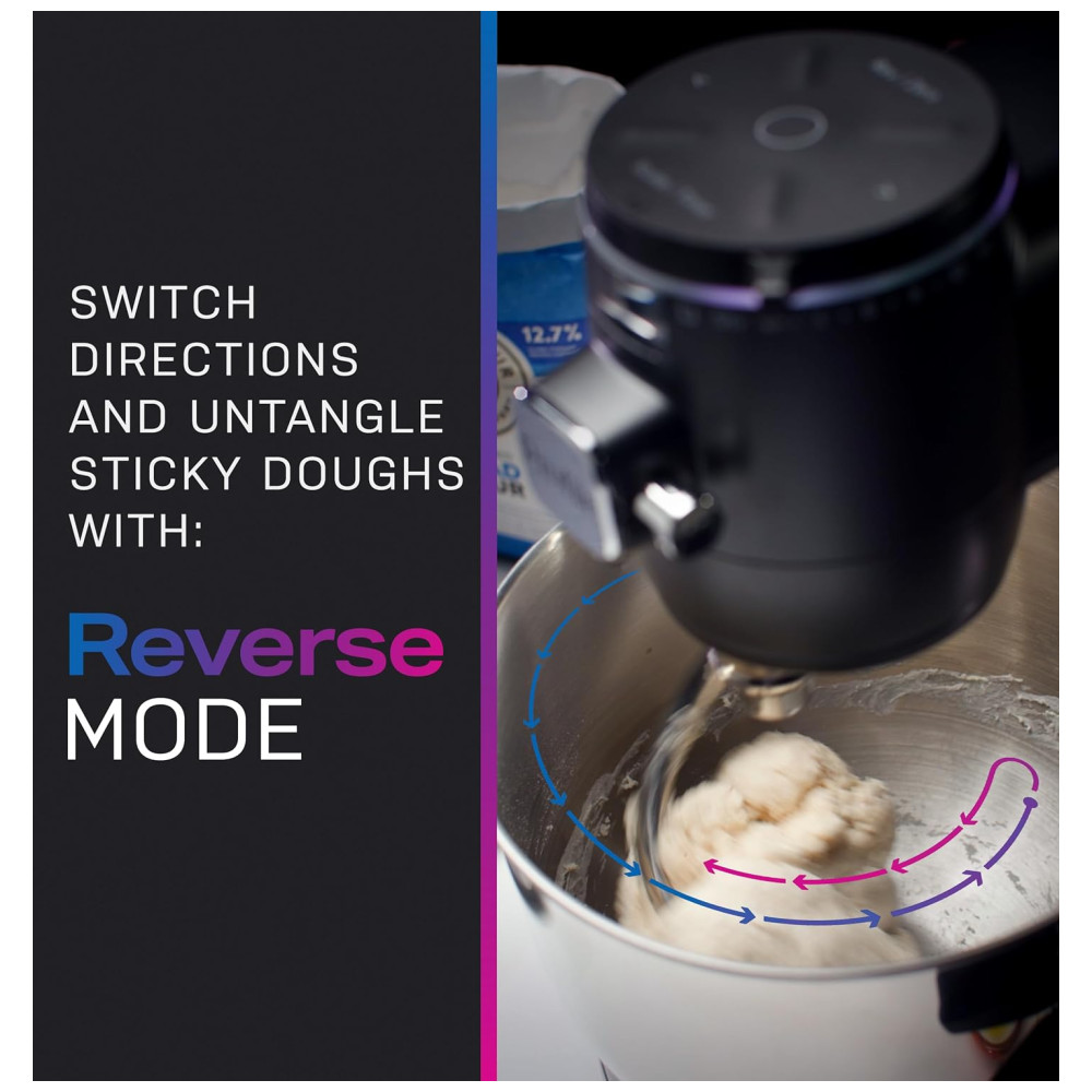 O Modo Reverso permite reduzir e desembaraçar a massa pegajosa, além de fazer backup dos acessórios para ajudar na raspagem da tigela usando um movimento reverso para frente. A tecnologia Auto Sense monitora ativamente as mudanças na textura e na viscosidade por meio do feedback de torque do motor para otimizar o desempenho da mistura. As falhas na mistura excessiva e insuficiente não são mais um risco em receitas que anteriormente exigiam intuição e experiência, pois um recurso de desligamento automático desligará o mixer quando a conclusão for alcançada.