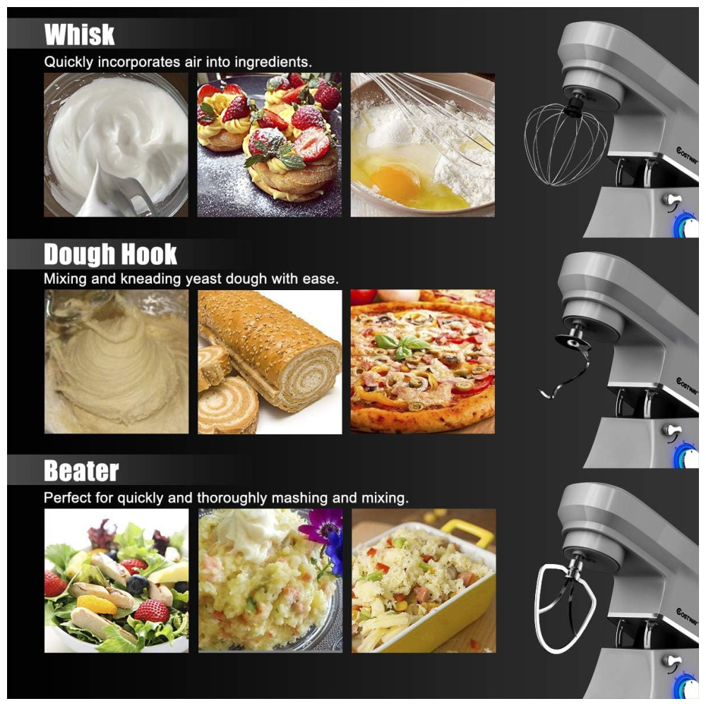Os 3 acessórios, batedor plano, gancho de massa e batedor de ovos permitem que ele seja versátil e suas 6 velocidades ajustáveis são projetadas para atender a várias operações com alimentos