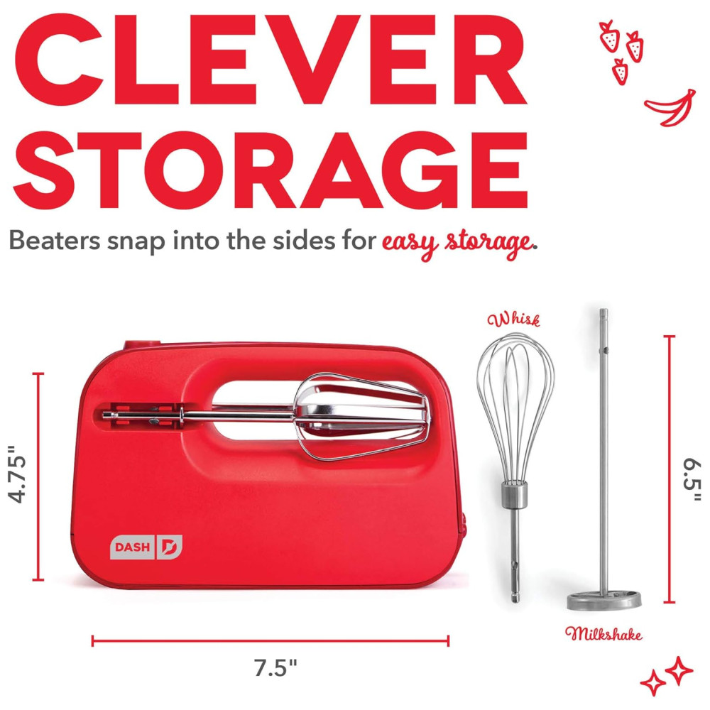 VERSITILIDADE Prepare um merengue arejado ou um bolo decadente com o misturador manual elétrico compacto Dash SmartStore Deluxe. Seu tamanho compacto ocupa pouco espaço no armário e fica plano na maioria das gavetas de cozinha.