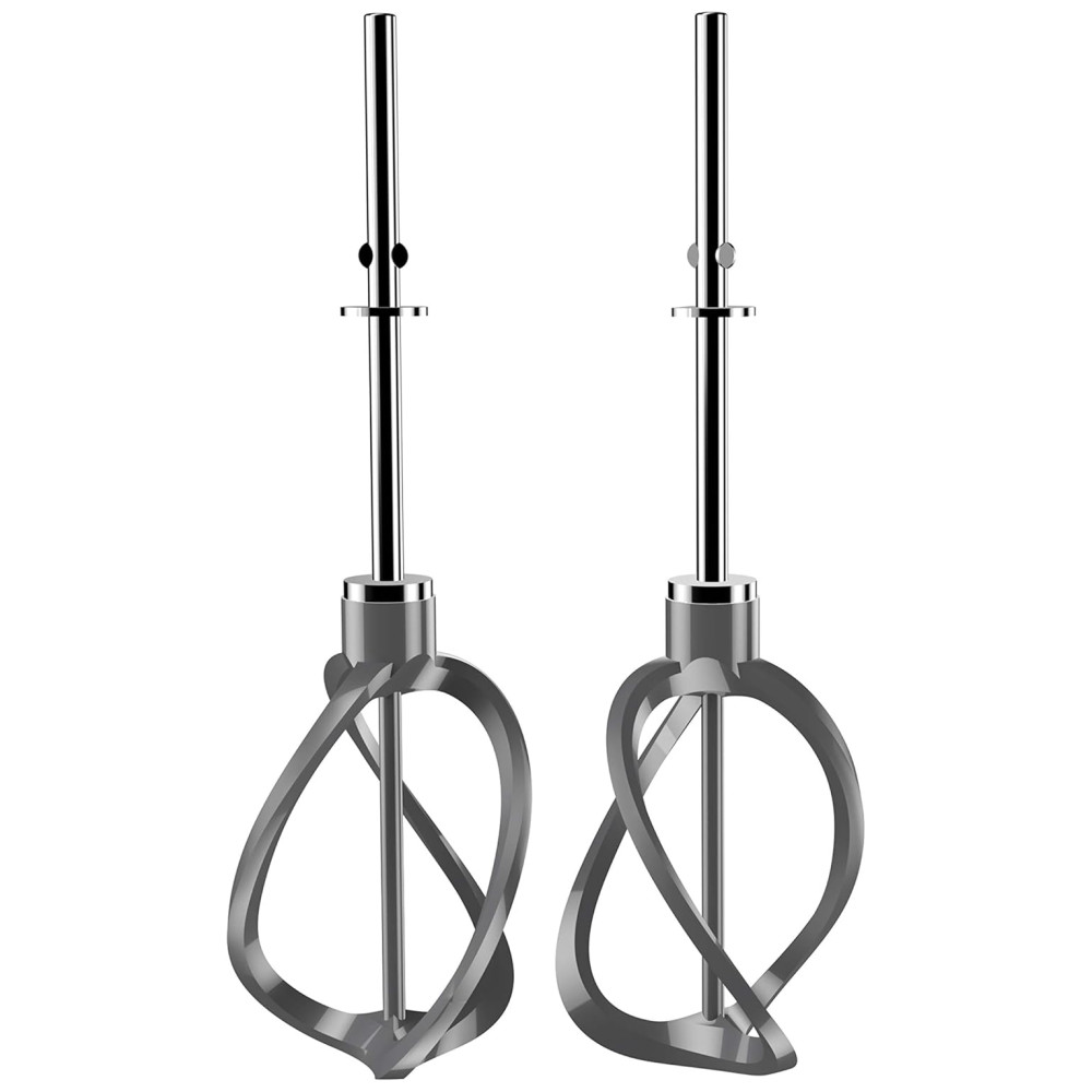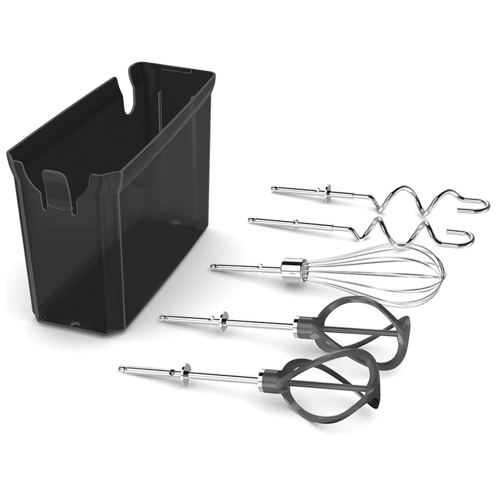 Este conjunto de mistura inclui dois batedores de hélice, dois ganchos de massa e um batedor de arame.