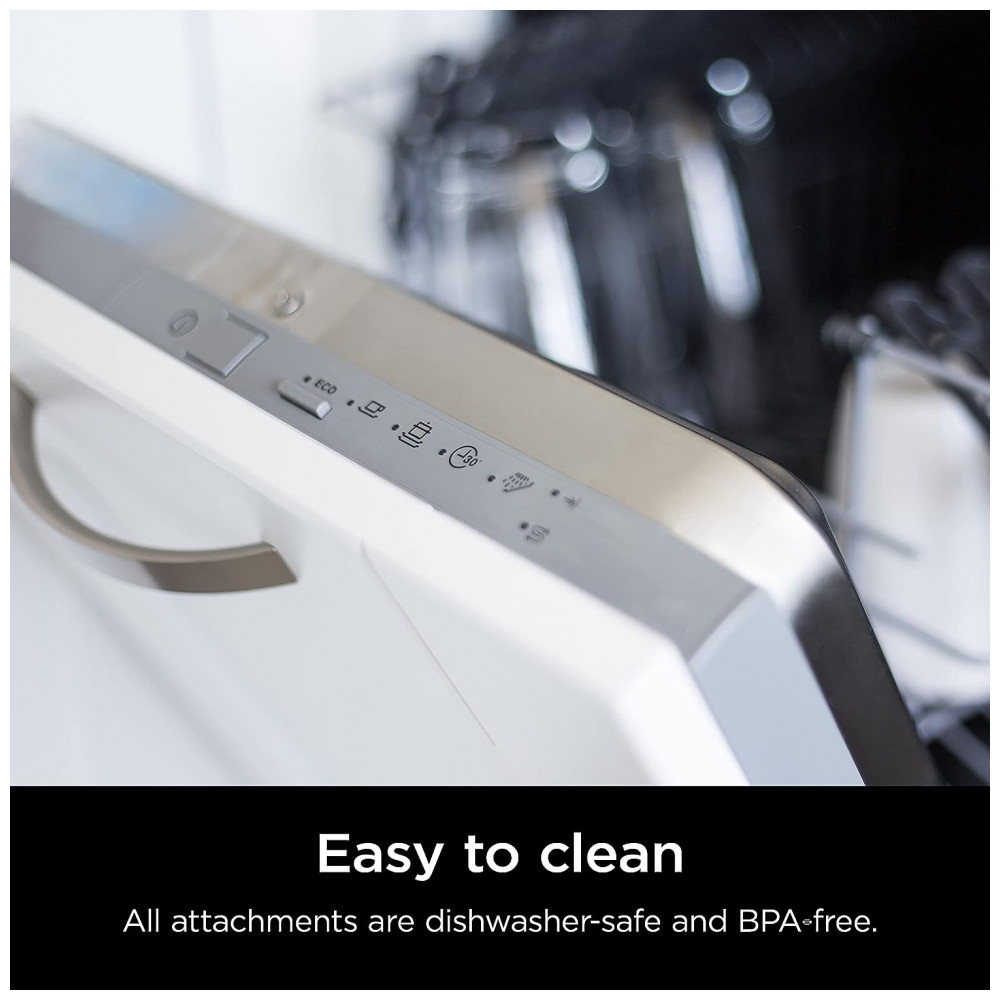 A limpeza é fácil com as peças que podem ir à máquina de lavar louça, facilitando sua vida na cozinha. O conjunto inclui o PowerBase com cabo de 0,46 m2, a haste de blendagem de 22,86 cm com lâmina de aço inoxidável e proteção de panela embutida, o acessório de mixer de mão com batedor e batedores EasyGlide, um recipiente de mistura de 3 copos com tampa de armazenamento e um guia com 20 receitas inspiradoras.