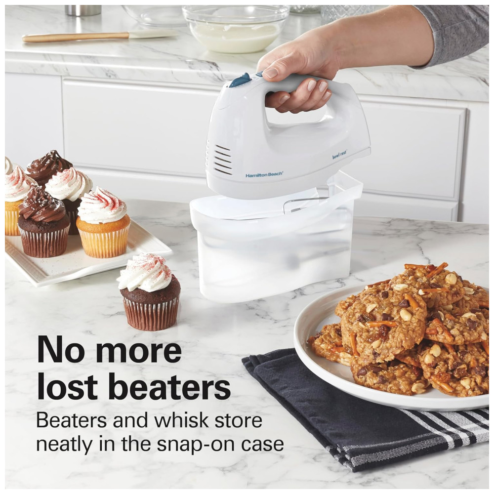 Prepare um merengue leve ou um bolo decadente com a batedeira de mão Hamilton Beach. Esta batedeira versátil é o seu eletrodoméstico essencial para misturar, bater e dobrar com 250W de potência máxima. Com seis velocidades e a função de aceleração rápida, você terá potência adicional em qualquer momento. Além do desempenho, a batedeira Hamilton Beach foi projetada para facilitar o armazenamento. Um prático estojo com encaixe mantém os acessórios juntos, evitando buscas constantes. Inclui batedores tradicionais e batedor de claras. Não perca mais os batedores, o estojo de armazenamento mantém tudo organizado. Com a Batedeira de Mão Hamilton Beach, você terá estabilidade sem inclinar, graças à função Descanso de Tigela que estabiliza a batedeira na borda da tigela.