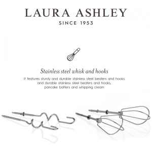 A batedeira de Mão Elétrico Laura Ashley VQ-SBSMR57-LAEN-US alia potência de 200W a 5 velocidades ajustáveis e função turbo, favorecendo o preparo de massas e cremes com precisão e rapidez. Equipado com batedores e ganchos em aço inoxidável, garante durabilidade e eficiência, enquanto o botão ejetor simplifica a troca de acessórios. O design ergonômico destaca-se pelo acabamento azul marinho com estampa floral Elveden, aplicada manualmente na carcaça.