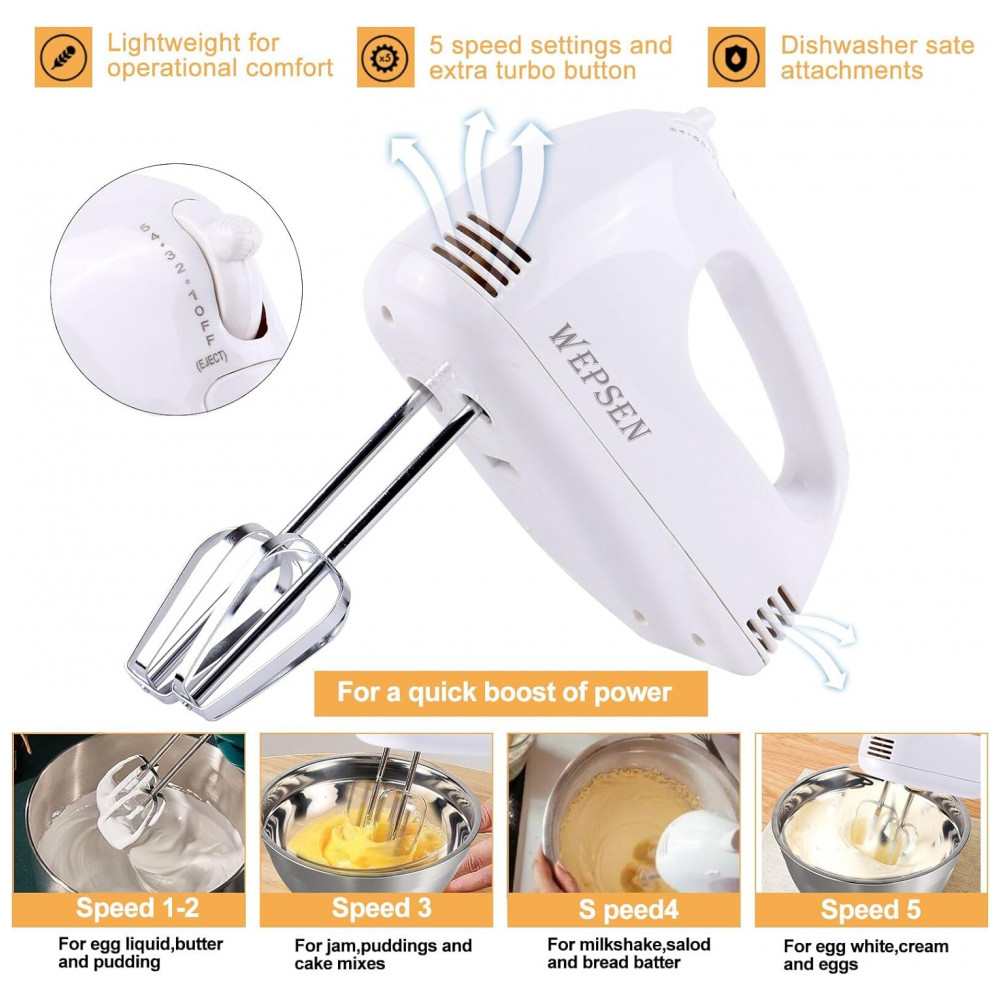 Mixer elétrico portátil Motor de 150 watts em 110 120Voltage com 5 velocidades O mixer portátil leve pode ajudar a encontrar a velocidade certa para cada tarefa de mistura. Você pode aumentar lentamente a velocidade para obter uma consistência de mistura ideal e evitar bagunças.