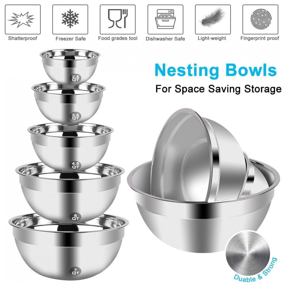 5 tigelas de aninhamento de aço inoxidável PCS vêm nos tamanhos 2,5, 3, 4,5, 6 e 7 quartos. A borda larga e plana garante uma aderência robusta para misturar, bater também servem tigelas de frutas, cozimento de ingredientes, preparação de cozimento e muito mais. Estas tigelas de cozinha são fáceis de limpar, manchar, resistentes ao sabor e economizar zenamento.
