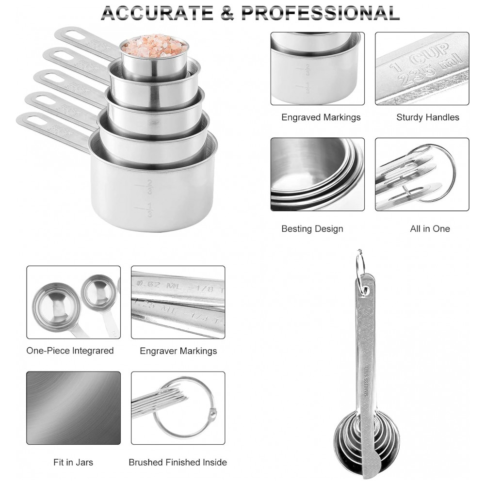 4 xícaras de medição PCS tamanhos 1 xícara, 1, 2 xícara, 1, 3 xícara e 1, 4 xícara. Tamanhos gravados fáceis de ler mostrando mls para medição de líquidos e secos. Os copos e colheres de medição são feitos de aço inoxidável 304 de qualidade alimentar. Eles são resistentes à ferrugem, garantindo que sua cozinha permaneça segura e saudável, com uma longa vida útil.