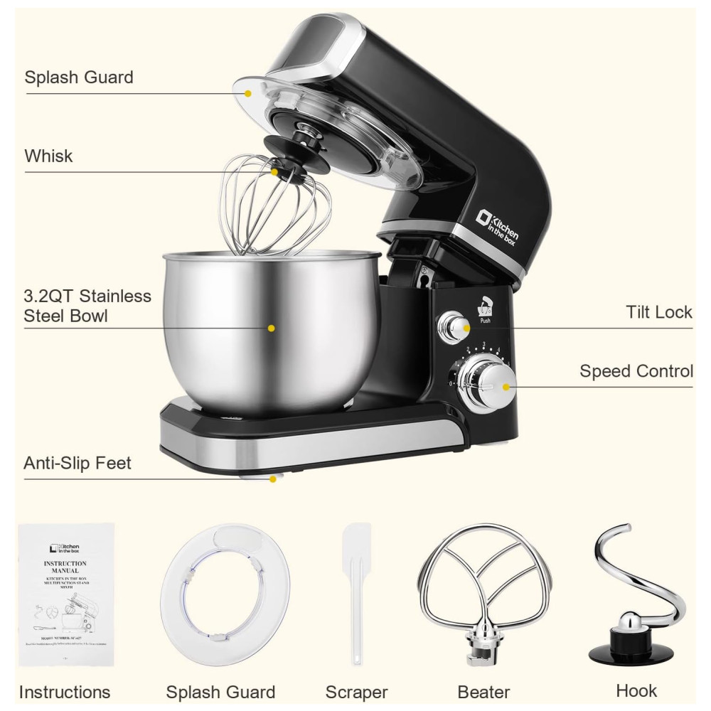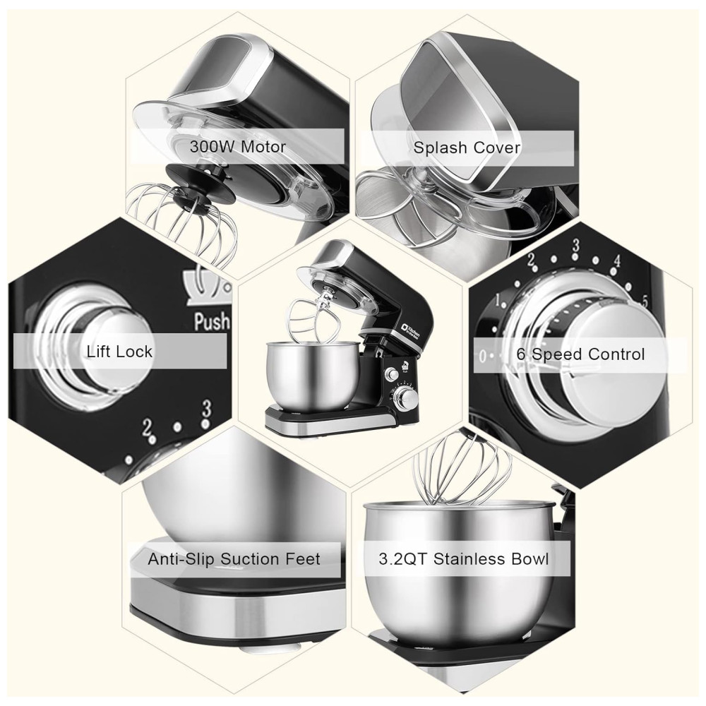 Batedeira Elétrica de Bancada 3.2 Litros 6 Velocidades em Aço Inoxidável 110V 300W Kitchen in the box Preta