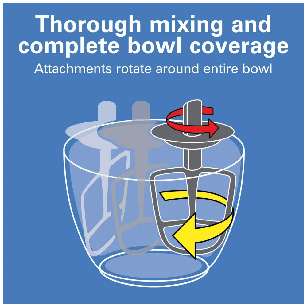 MISTURA COMPLETA E COBERTURA COMPLETA DA BACIA. À medida que você mistura, cada acessório gira em torno de toda a tigela à medida que gira na velocidade selecionada. Essa ação de mistura planetária garante que os ingredientes sejam bem misturados e fornece cobertura completa da tigela.