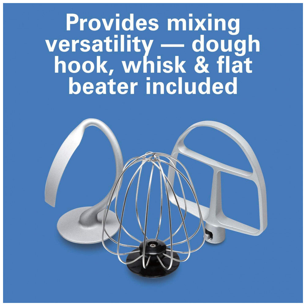 FORNECE VERSATILIDADE DE MISTURA GANCHO DE MASSA, BATEDOR E BATEDOR PLANO INCLUÍDO 3 acessórios versáteis permitem que você faça tudo, desde amassar massa de pizza até misturar massa de biscoito e chantilly