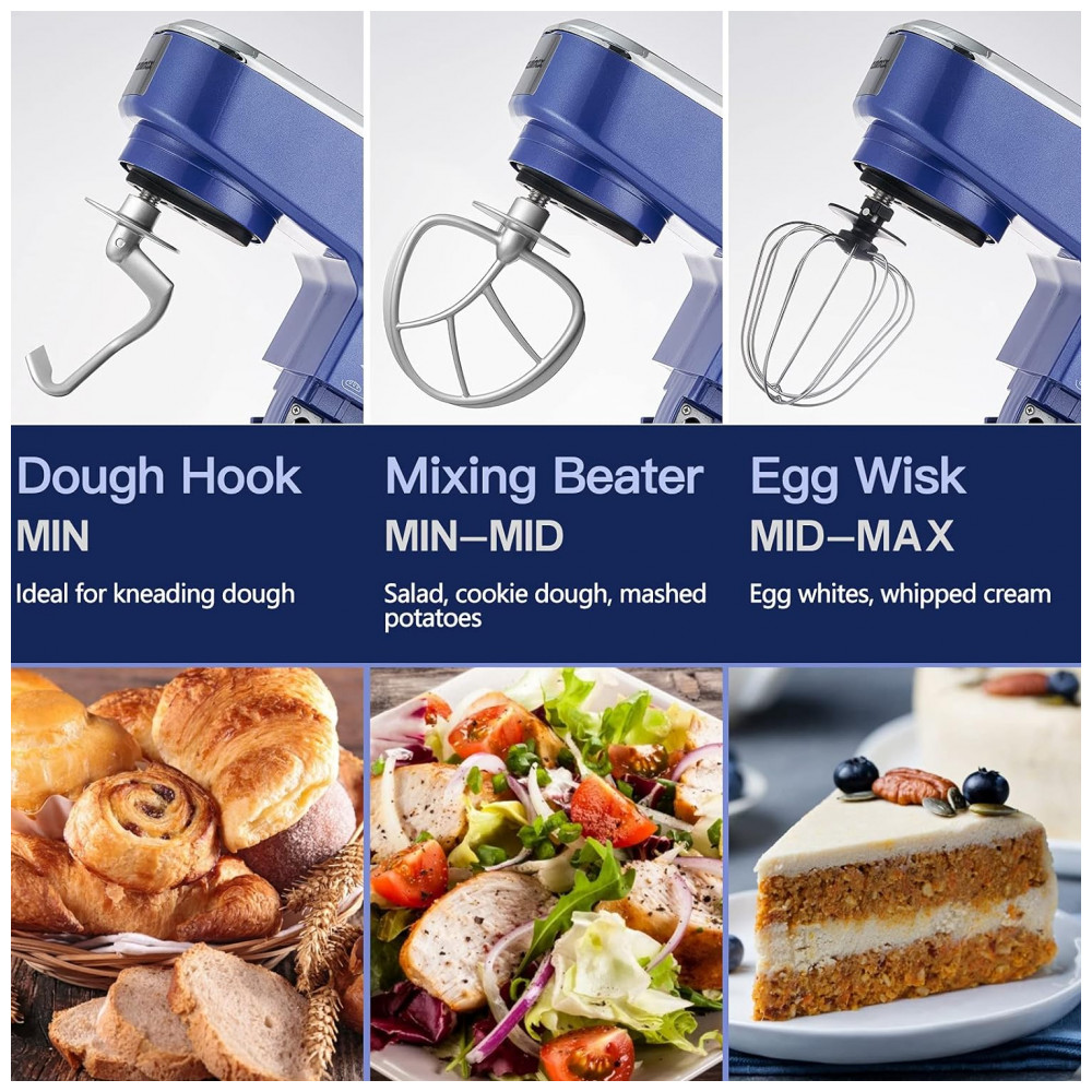 ACESSÓRIOS MULTIUSOS A batedeira vem com 4 acessórios diferentes, incluindo gancho de massa, batedor, batedor e espátula de plástico. Quer faça pão, pizza, bolos, bolachas, muffins, saladas, pudins ou outras iguarias, cada um dos acessórios pode ajudá lo. Todos os acessórios são laváveis.