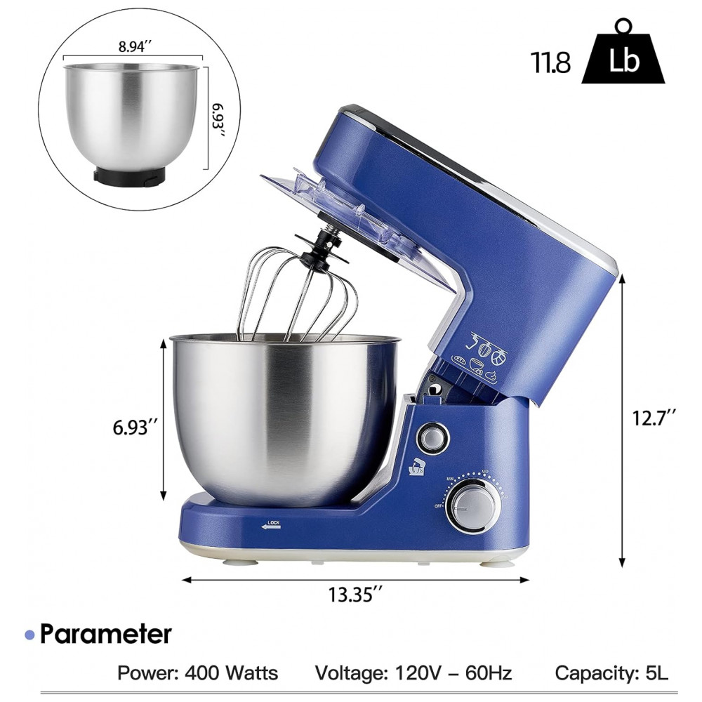 CAPACIDADE SUFICIENTE A batedeira está equipada com uma tigela de aço inoxidável de 5 litros, fornecendo capacidade suficiente para lotes maiores de cozimento, adequados para sua família. A tigela de aço inoxidável de qualidade alimentar é mais fácil de limpar. O protetor de respingos com porta de acesso ajuda a adicionar ingredientes sem fazer bagunça, deixa você cozinhar com muita facilidade, aproveite para preparar pratos caseiros.
