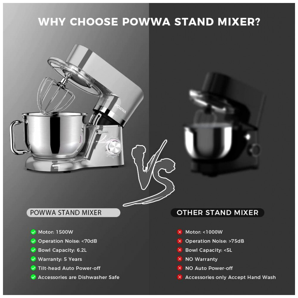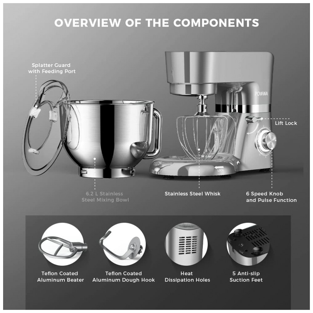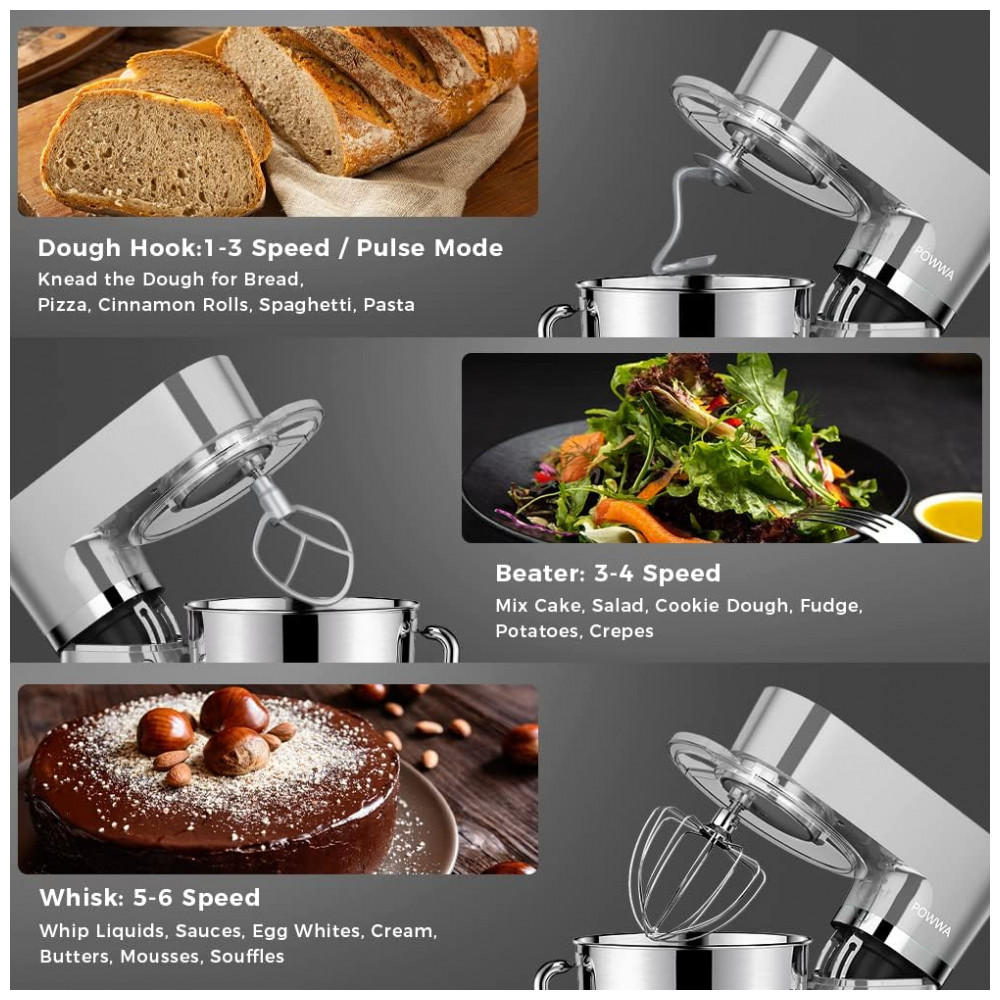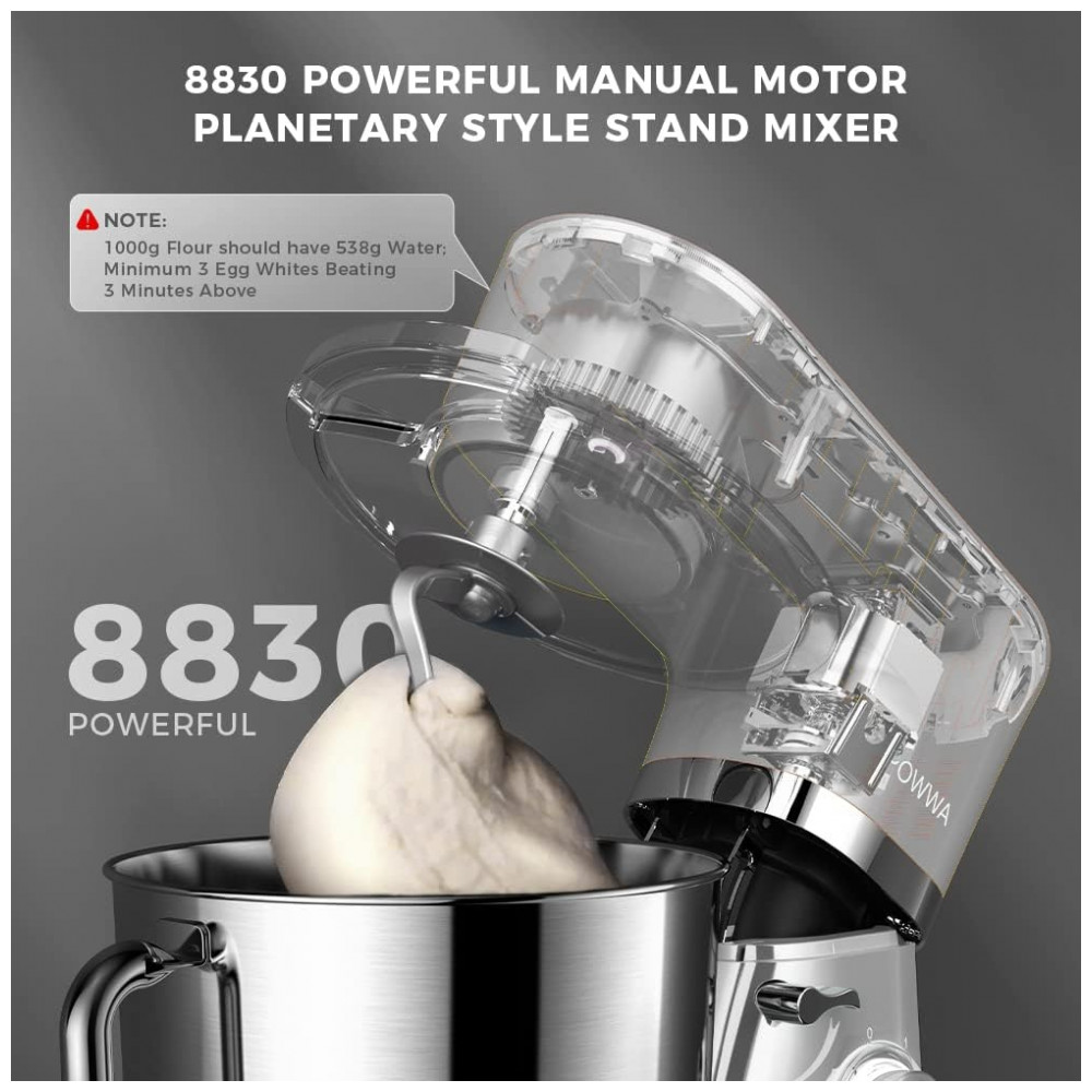 Motor potente de 660W O misturador de suporte elétrico POWWA possui um motor manual 8830 de alta qualidade com consumo de energia de 660W, possui longa vida útil e fornece energia forte para atender à maioria dos seus requisitos para um misturador de cozinha ruído de operação 70dB