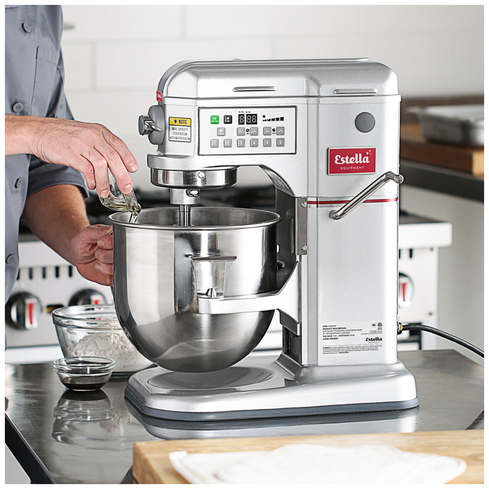 Projetado com aplicações comerciais em mente, o Misturador de Bancada Estella EMIX8 possui um motor de 45 hp com transmissão total, oferecendo capacidades de mistura robustas. Com 5 velocidades variáveis e temporizador de 30 minutos, é uma escolha versátil para fazer bolos, bater batatas ou aerar claras de ovos. Com capacidade máxima de 1 kg de farinha por lote, este misturador inclui uma tigela de aço inoxidável de 7,57 Litros e acompanha um batedor de arame, gancho para massa e pá plana em aço inoxidável. Possui controle digital intuitivo com 6 funções programáveis e timer. Inclui acessórios duráveis, como batedor de arame, gancho para massa e pá plana, todos em aço inoxidável. Com 5 pontos de fixação de acessórios, pode ser usado como uma ferramenta versátil na cozinha ou padaria. Possui alarmes de segurança e elevação da tigela assistida por mola. Voltagem: 110V, 600W.