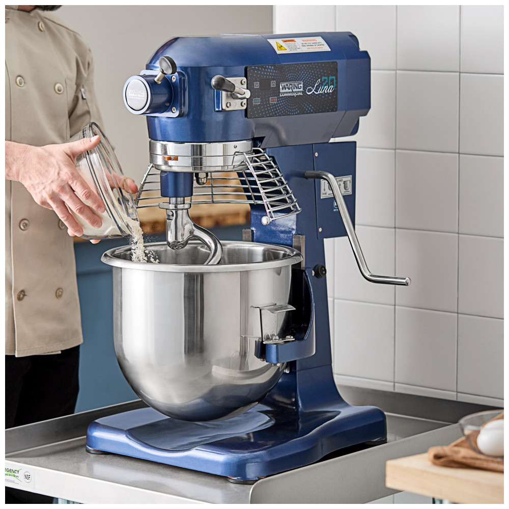 O misturador planetário comercial de 18,93 Litros Waring Luna é uma adição perfeita para qualquer cozinha que precisa misturar rapidamente ingredientes! Possui uma tigela de aço inoxidável de 18,93 Litros com alça que suporta uso frequente. Com timer, pode operar de forma temporizada ou contínua. O motor de indução pesado de 1 hp e transmissão geardriven permanentemente lubrificada oferecem a potência necessária para lidar com massas e batedores espessos. Controle fácil com botões de controle laterais e velocidades ajustáveis. Acompanha batedor, gancho de massa e pá de mistura de alumínio. Com pés antiderrapantes e protetor de segurança. Requer conexão elétrica de 110V.