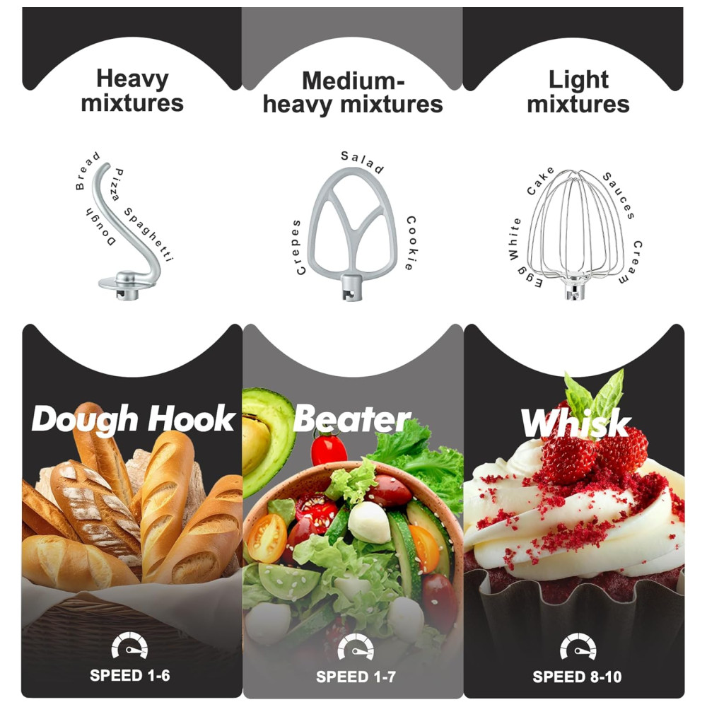 A Batedeira Kitchen in the box combina design elegante com acabamento matte único, proporcionando não apenas um ótimo desempenho, mas também um visual sofisticado. Com duas tigelas de 4,25Litros em aço inoxidável e 4,73Litros em plástico seguro para alimentos, é perfeita para diversas necessidades de mistura e cozimento. Possui 10 velocidades para lidar com massas pesadas, claras em neve, cremes de bolos e receitas delicadas, com inclinação facilitada para troca de tigelas e acessórios. Os acessórios aprimorados, como gancho de alumínio e batedor plano, são resistentes e podem ir à lava-louças, garantindo praticidade.