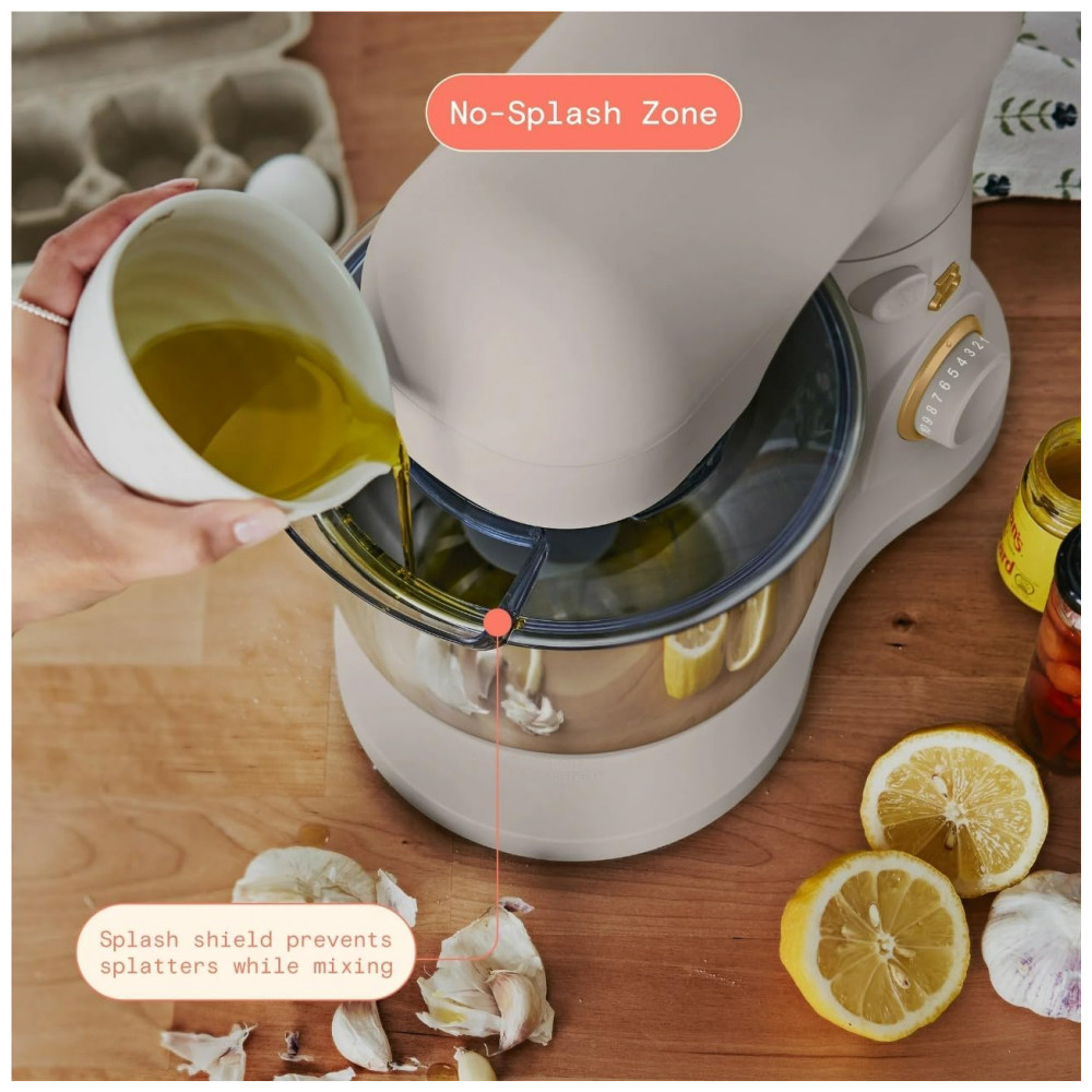 A estrutura com cabeça basculante facilita o acesso à tigela em aço inox e a troca dos acessórios, enquanto o acabamento fosco foi desenvolvido para uso em bancada. O conjunto inclui batedor tipo pá, batedor de arame, gancho para massas e protetor contra respingos, com peças removíveis compatíveis com lava-louças.
