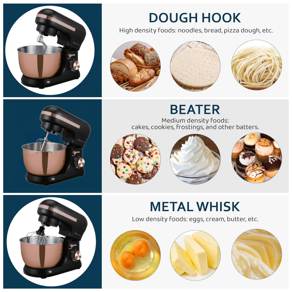 A batedeira planetária retrô CULINARY CHEF Rose Gold Bowl Edição Especial foi projetada para preparo doméstico de massas, coberturas e misturas diversas, combinando tigela em aço inox de 4,5 litros com motor elétrico e controle manual de velocidades. A capacidade da tigela permite produzir desde pequenas até médias porções de massas para bolos, pães, biscoitos e outras receitas, atendendo rotinas de cozinha residencial.