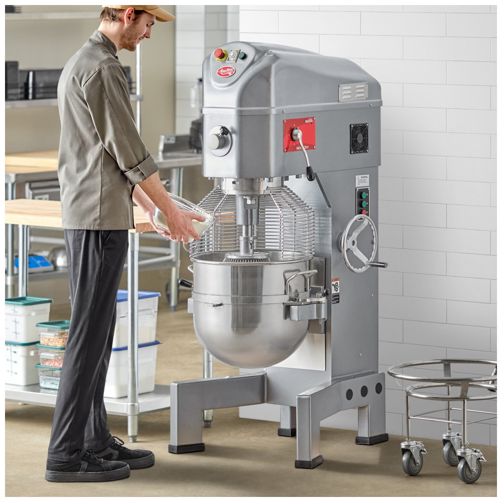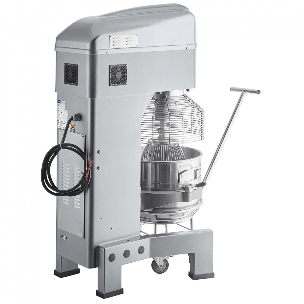 A robusta batedeira de piso possui pés de alta resistência para estabilidade. Conta com elevador elétrico de tigela e carrinho para facilitar o transporte. Inclui batedor de arame em aço inoxidável, misturador de massa em alumínio fundido e gancho para massa. Fácil de usar com botões simples de ligar/desligar e interruptor de segurança para garantir que a proteção da tigela esteja no lugar. Com um motor potente de 2 1/2 hp e transmissão de 3 velocidades, essa batedeira é ideal para qualquer tarefa, desde massa de bolo até massa de pizza. Não há risco de deslizamento do sistema de acionamento, comum em modelos de correia. Possui elevador manual de tigela que ajusta a altura da tigela para a mistura com apenas a rotação de uma manivela. Inclui um cubo de 1/2. O interruptor de sobrecarga automático corta a energia em caso de sobrecarga, protegendo a máquina, enquanto a proteção da tigela em aço inoxidável impede o contato de roupas, utensílios ou mãos dos funcionários com o agitador em uso. Além disso, possui um timer de 30 minutos para maior conveniência. Para segurança, a batedeira não funciona se a proteção da tigela estiver aberta, se a tigela estiver abaixada ou se a tigela for removida. Por conta do tamanho da tigela, esse modelo conta com elevador de tigela elétrico com botões de fácil ajuste, eliminando a necessidade de girar manualmente a tigela. Um elevador manual também está incluso para maior comodidade. E, além da tigela de aço inoxidável de 56,78 Litros, essa batedeira vem com diversos acessórios, incluindo um batedor de arame em aço inoxidável para líquidos e alimentos macios, um misturador de alumínio fundido para ingredientes secos, e um gancho de alumínio fundido para amassar pão ou massa de pizza em baixa velocidade.