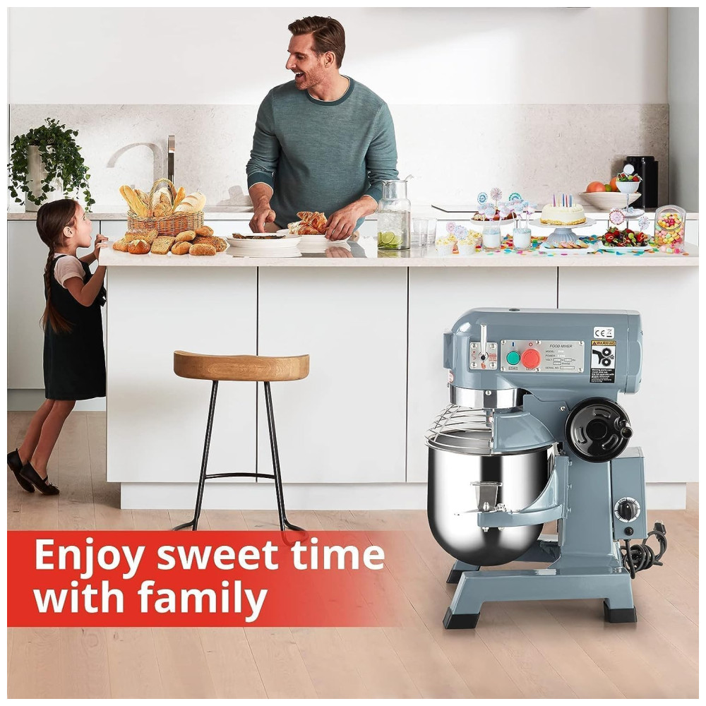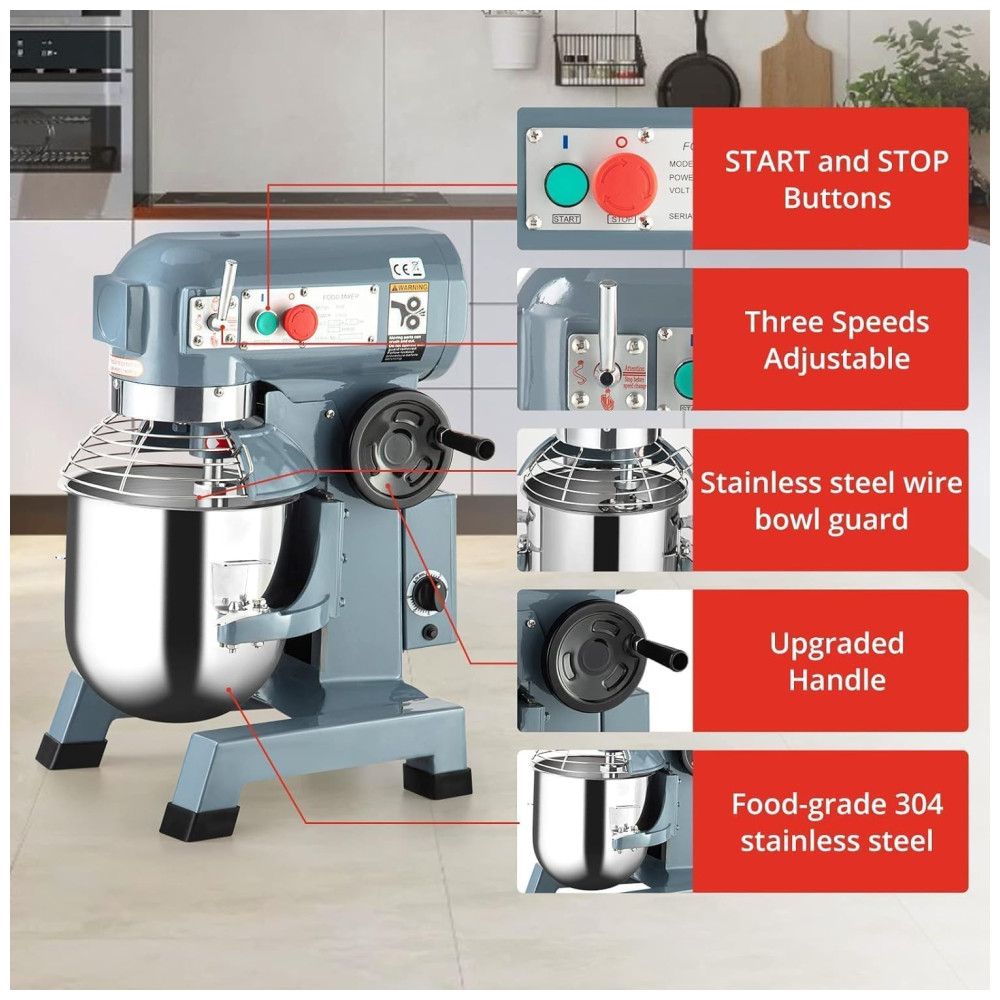Para garantir a segurança durante o uso, a batedeira possui um protetor de aço inoxidável que evita que itens caiam na tigela durante a operação e possui função de desligamento automático. Os botões START e STOP operam de forma independente, garantindo segurança. A operação é simples e conveniente, e a batedeira está equipada com pés antiderrapantes para reduzir vibrações e ruídos.