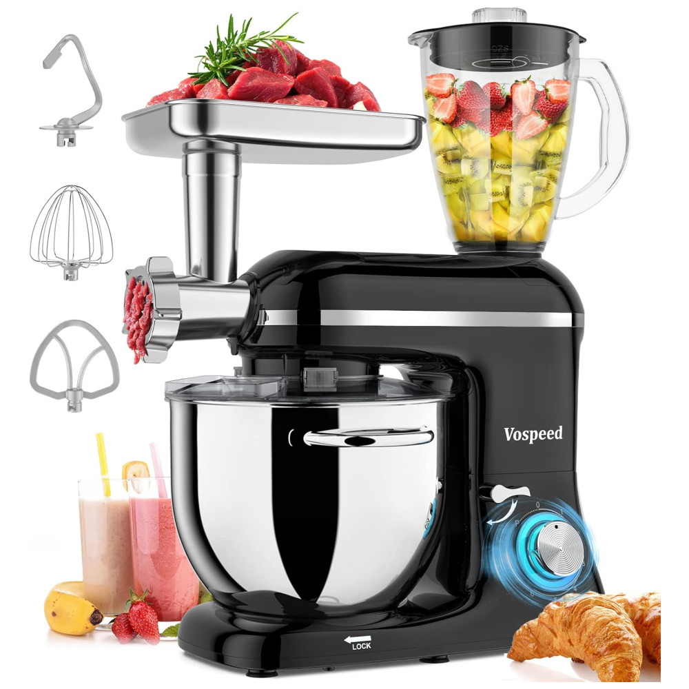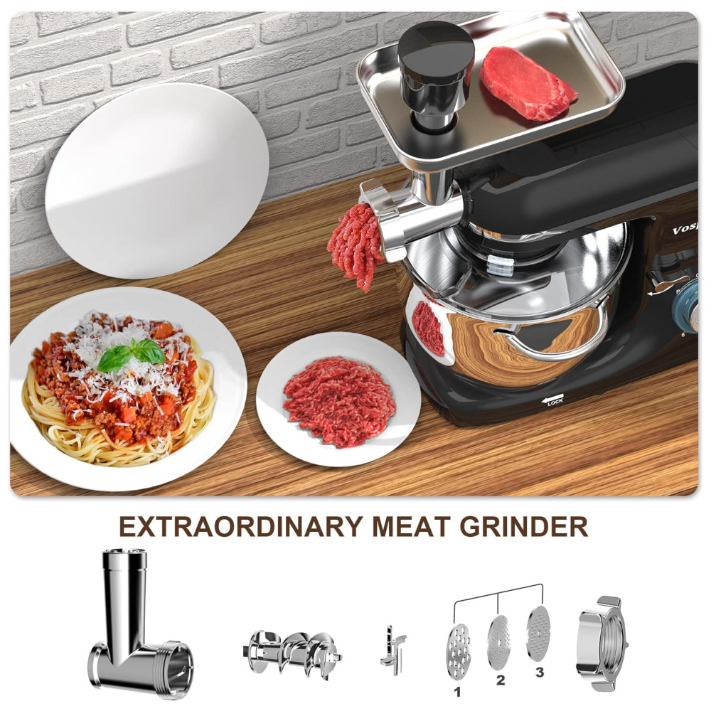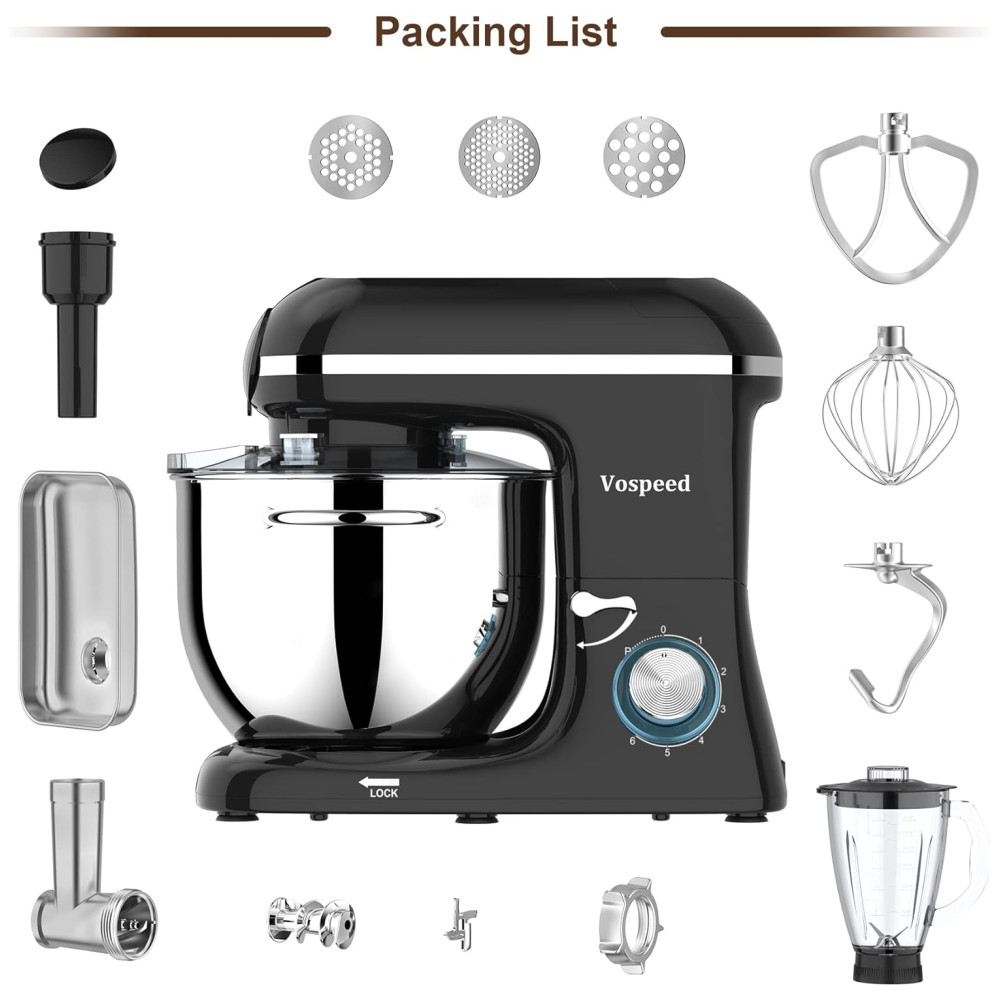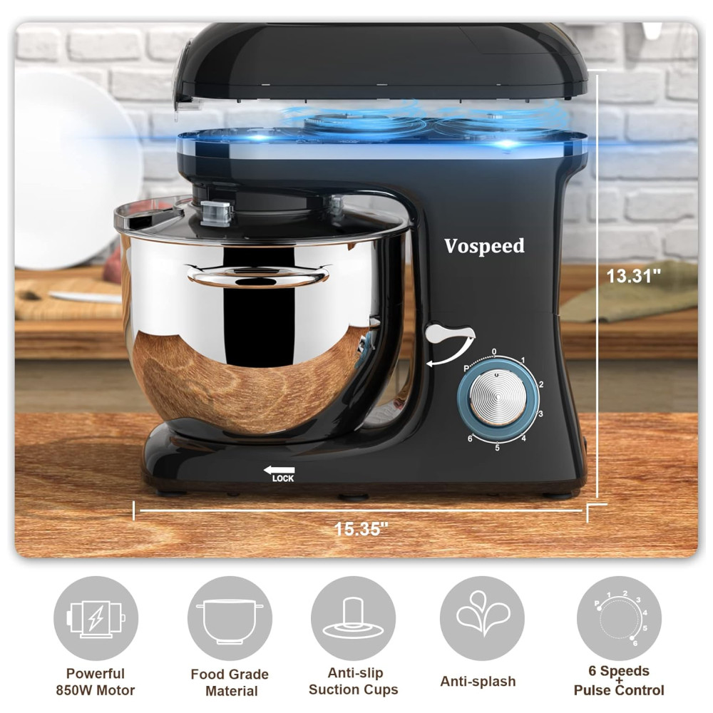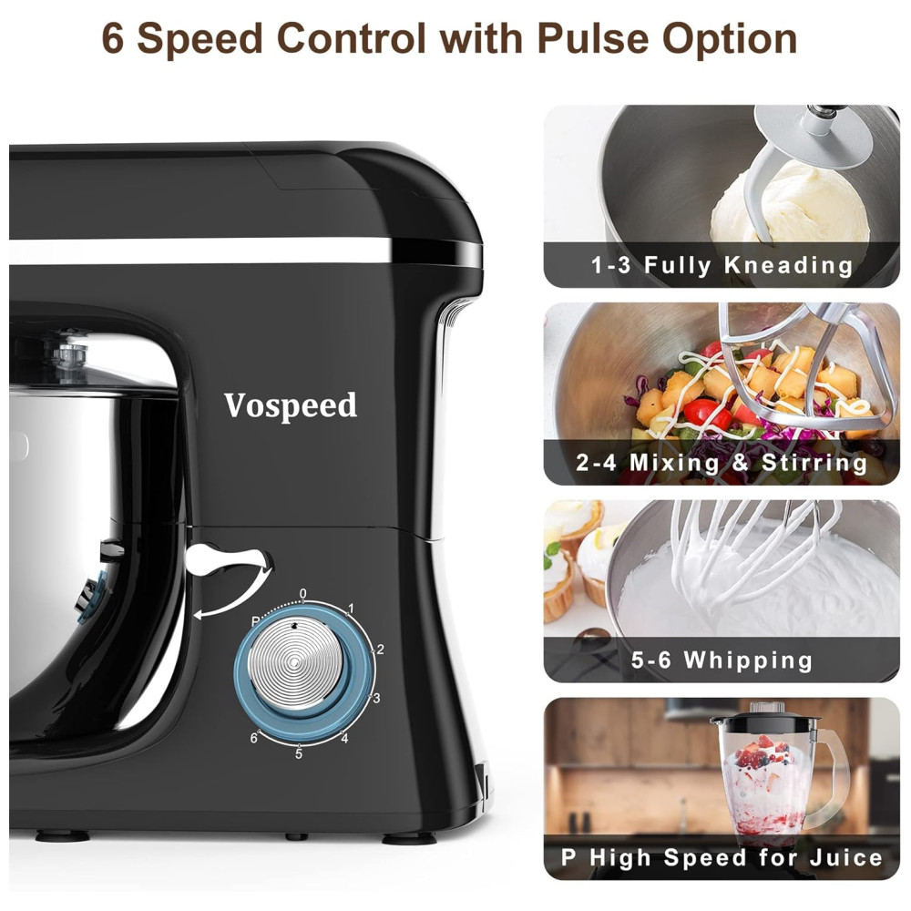 Motor de potência 850W e 6 controle de velocidade de pulso Vospeed stand up mixer apresenta motor de cobre puro de 850W de alto desempenho com um sistema de agitação planetário e 6 velocidades otimizadas com função de pulso, acesso a multiuso e uma variedade de receitas. O pulso pode atingir a velocidade máxima em um segundo, para bater claras em neve. A temperatura do sensor do chip embutido desliga automaticamente quando superaquecimento, segurança e proteção.