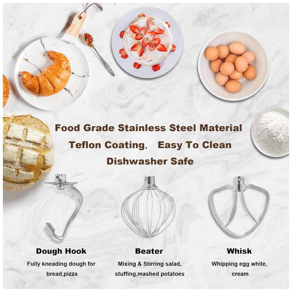 Design com cabeça inclinada e antideslizante A máquina de fazer massa com cabeça inclinada não só permite acesso fácil à tigela da batedeira e batedor, mas também fácil de instalar e remover a tigela de aço inoxidável e 3 acessórios. 4 fortes ventosas de silicone na base ajudam a prendê lo ao balcão e evita caminhar durante a operação. A batedeira tem um cinto decorativo de aço inoxidável e luz LED azul como indicador de energia. Sem dúvida, um dos melhores eletrodomésticos da sua cozinha