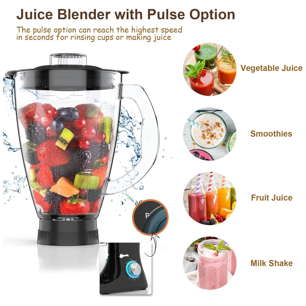 Tigela de mistura de 7,5 QT e jarra de vidro de 1,5 L A tigela de massa de 7,5 litros e a alça dupla são feitas de aço inoxidável para garantir vida longa e operação segura. Grande capacidade significa que você pode misturar a massa, em um único lote, para 6 pães, 9 libras de purê de batata ou 11 dúzias de biscoitos. A batedeira vem com uma jarra de vidro de 1,5 L para fazer shakes, smoothies e muito mais.