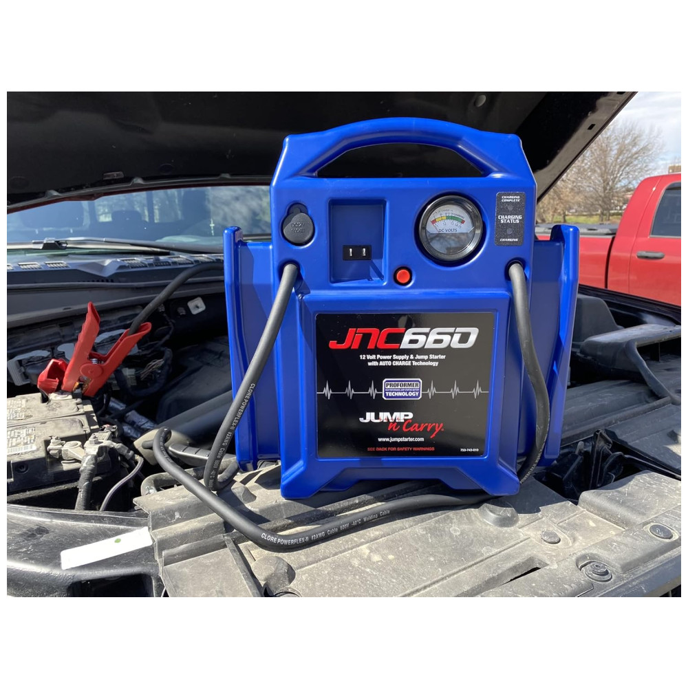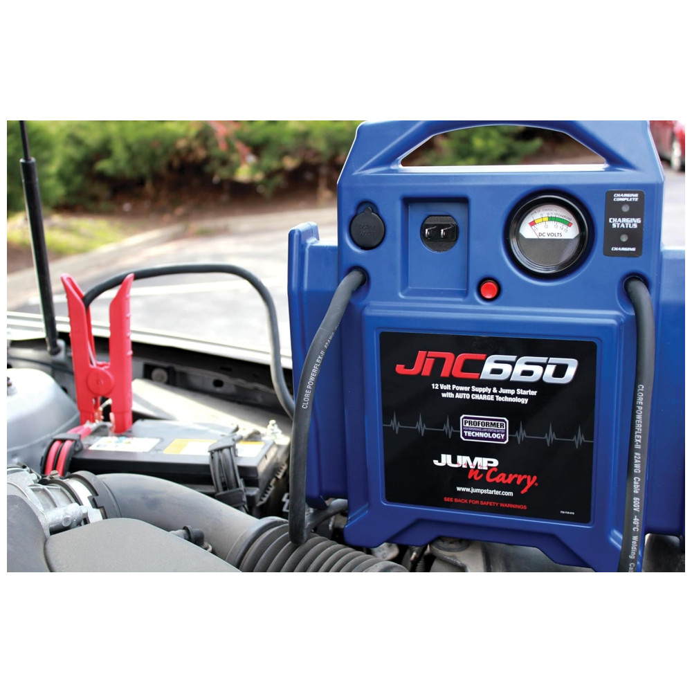 1.7lificadores de pico 4ères de arranque. Carregador embutido. Tipo de Carregador Automático A tecnologia de baterias PROFORMER foi projetada para fornecer saída de potência extremamente alta, potência de acionamento prolongada e uma longa vida útil cabos AWG n 2 para serviços pesados de 46 polegadas cobre isolado voltímetro fornece status de carga da bateria onboard tomada DC para alimentar acessórios de 12 volts Entrada CC para recarregar a bateria interna Quando a unidade não estiver em uso, recomendamos que a bateria seja carregada pelo menos a cada 30 dias. Jump N Carry JNC660 Arrancador de Salto de 12 Volts Ampère de 1700