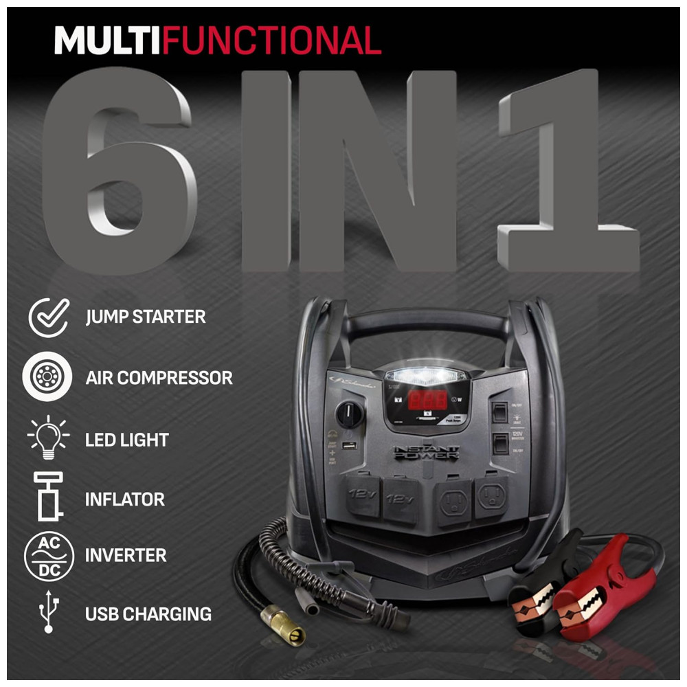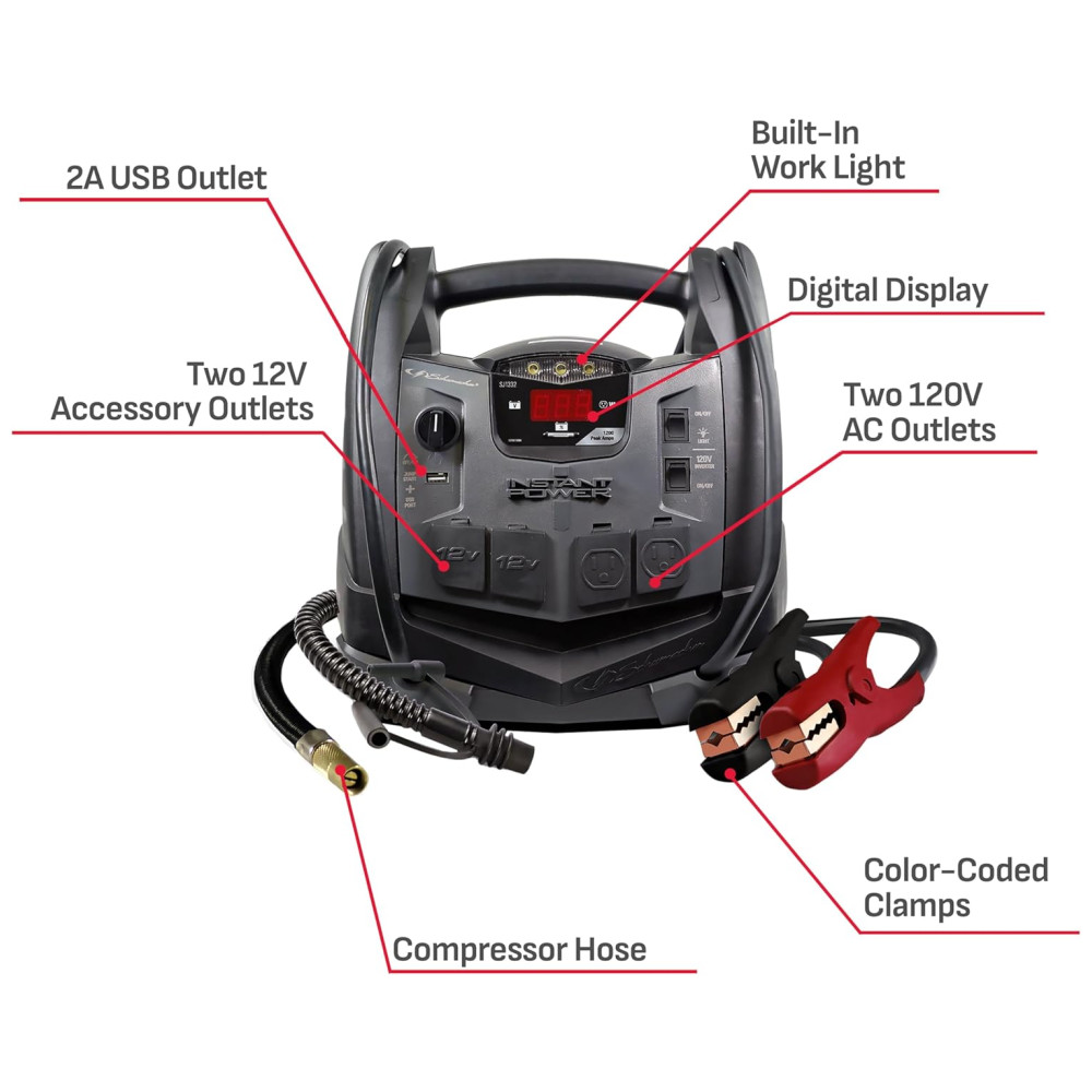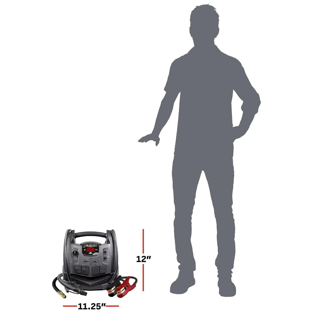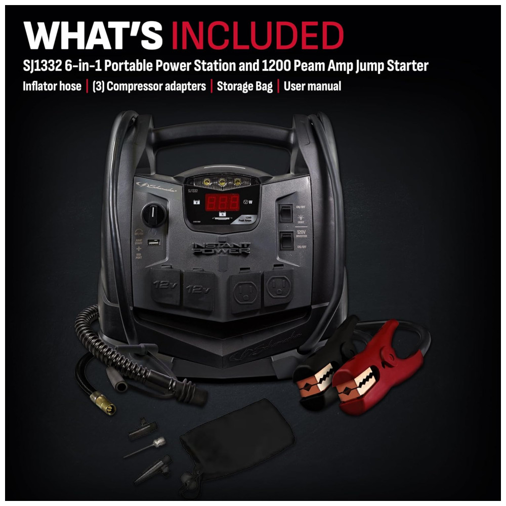 Oferece 1200 Peak Amps para saltar iniciar o seu veículo Características 2 120V AC e uma porta USB para poweer seus dispositivos Inclui compressor de ar 150PSI com calibre de pressão, bicos e área de zenamento Display digital monitora o nível de carga da bateria interna e tensão de bateria do veículo Funciona com motores V8. Construído para início de salto pesado, o SJ1332 é perfeito para o motor de partida de baterias robustas, bem como fornecer energia AC em movimento. A partir da linha Jump Starters da Schumacher, esta unidade oferece 2 saídas AC, uma porta USB e um compressor de ar. Esta unidade fornece 1200 Peak Amps para dar partida em veículos em emergências. O mostrador digital monitora o nível de carga da bateria interna e a voltagem da bateria do veículo. Inclui luz embutida com LEDs ultra brilhantes com eficiência energética. A Schu Eco Energy atende aos mais altos padrões do setor