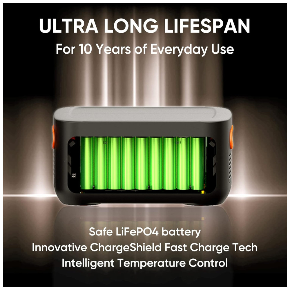 A tecnologia de carga rápida ChargeShield da Jackery aumenta a vida útil da bateria do Expansion Battery Pack 2000 Plus em 50 . A bateria LiFePO4 segura com até 10 anos de uso prolonga significativamente a vida útil. Além disso, a empresa oferece excelente atendimento ao cliente.