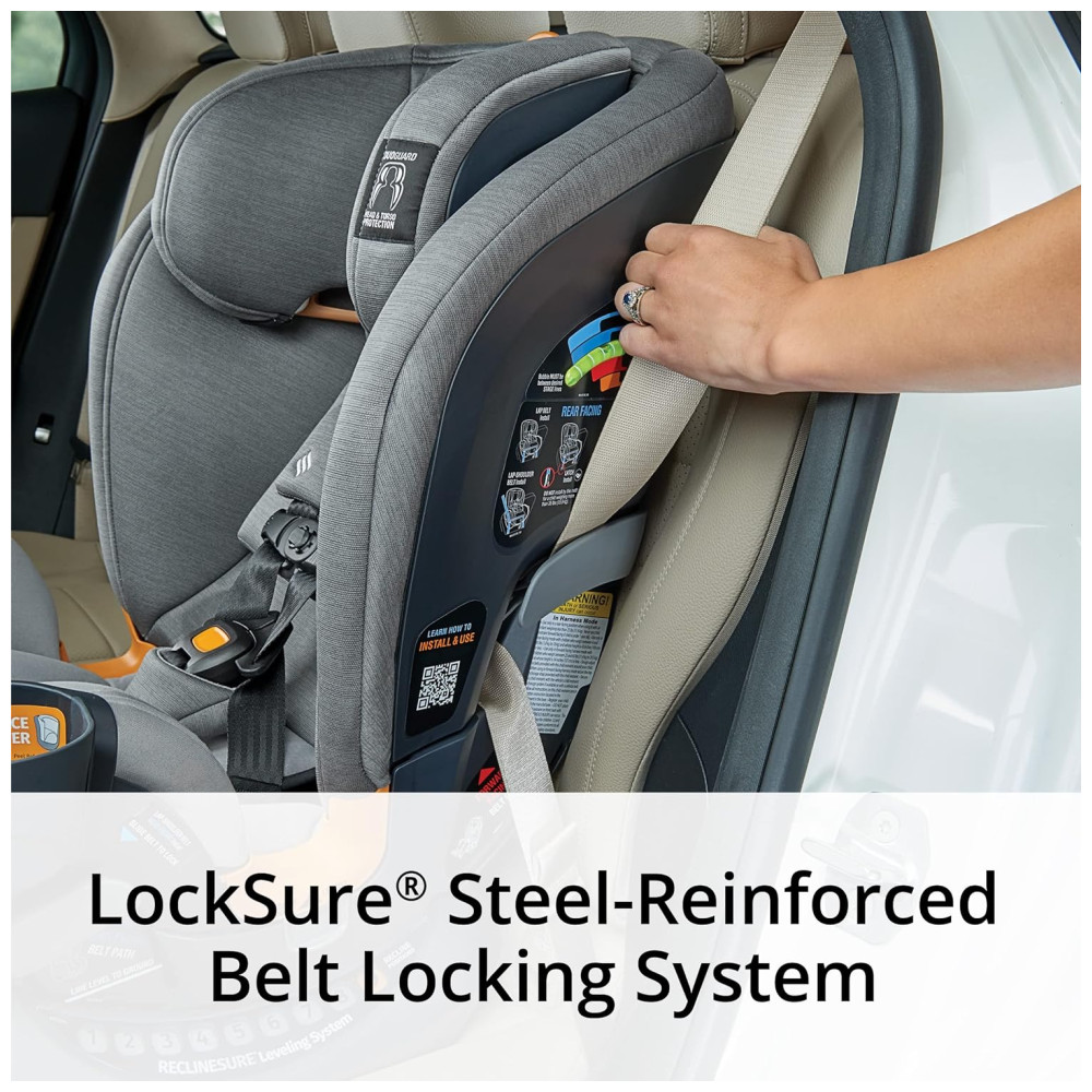 Adapta se ao seu filho Espaço para crescer com espaço extra para as pernas virado para trás e a mais ampla gama de ajuste de altura do encosto de cabeça. O DuoGuard oferece duas camadas de proteção com uma estrutura reforçada com aço e espuma EPS absorvente de energia que envolve a cabeça e o tronco.
