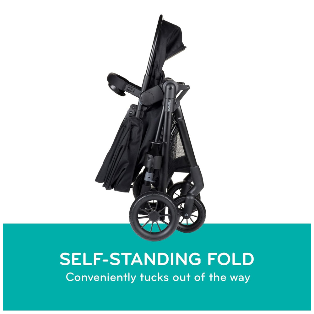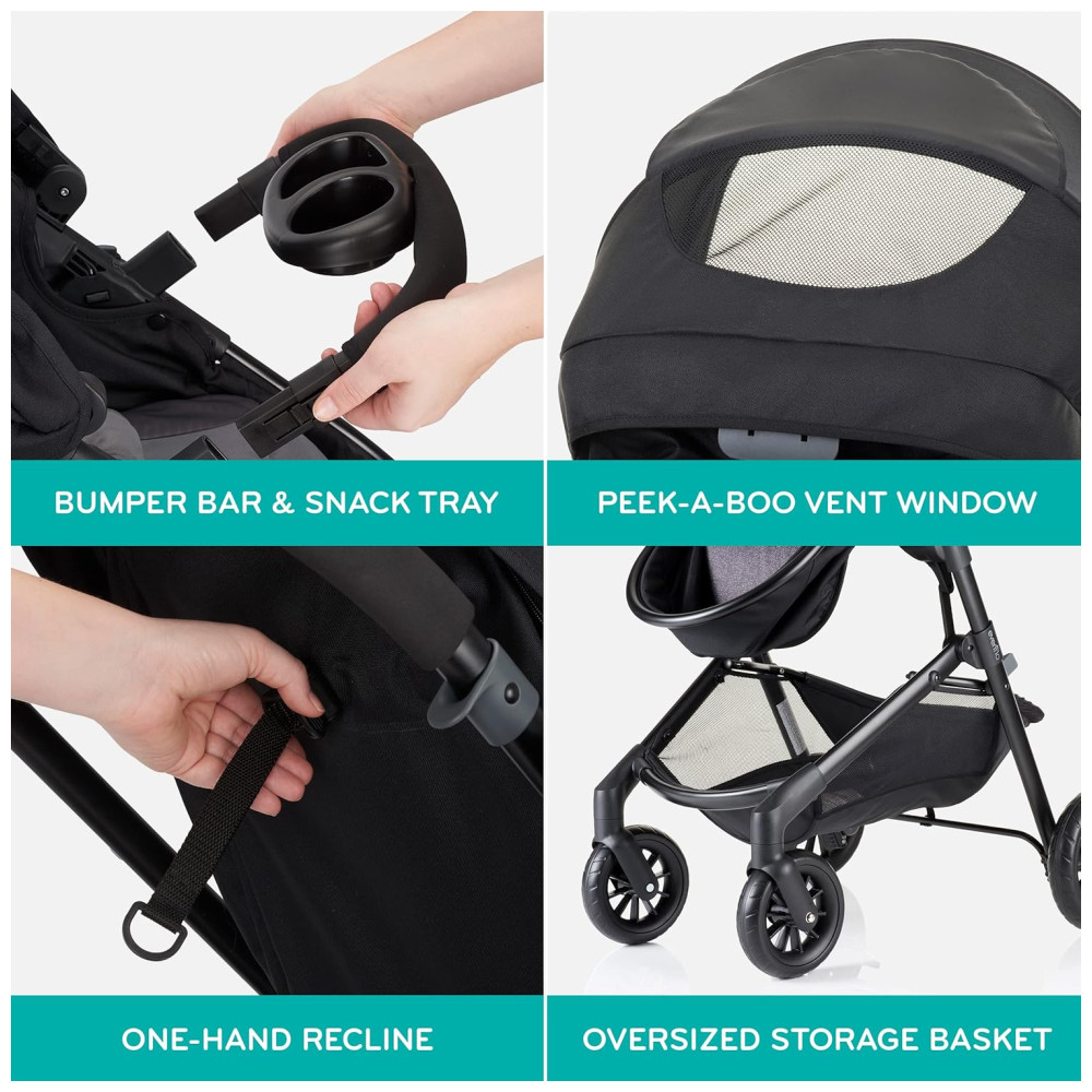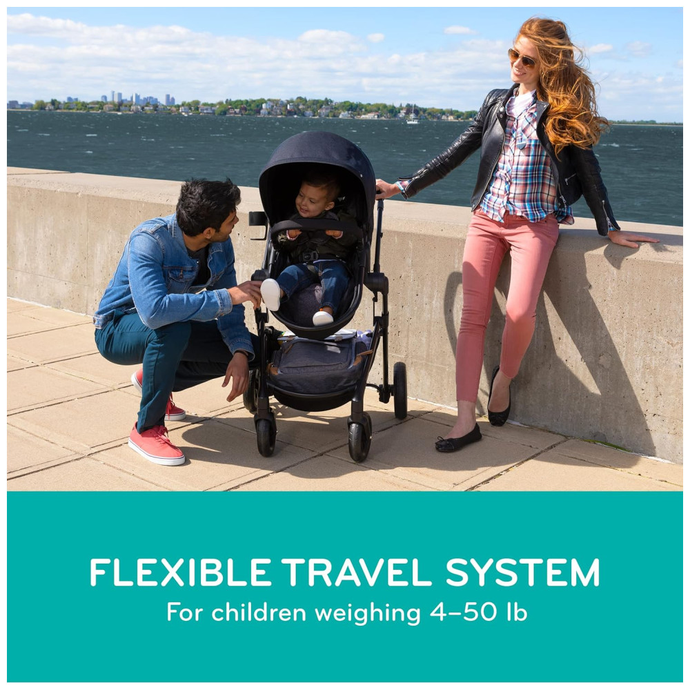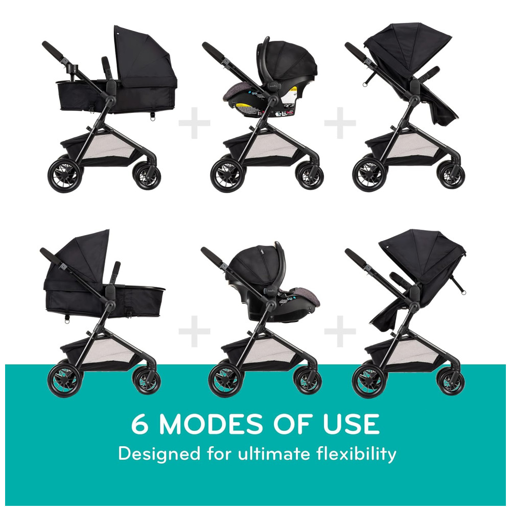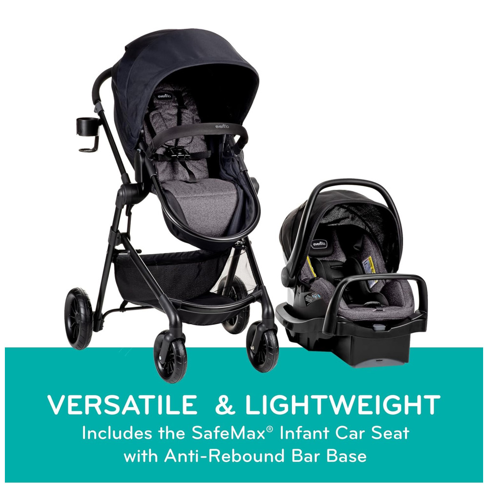 SISTEMA DE VIAGEM PARA INFANTE FLEXÍVEL O Evenflo Pivot Modular Travel System é uma combinação de assento de carro e carrinho de passeio com o assento de carro infantil voltado para trás SafeMax e a base SafeZone com barra anti rebote, infundida com acessórios adequados para pais e crianças.