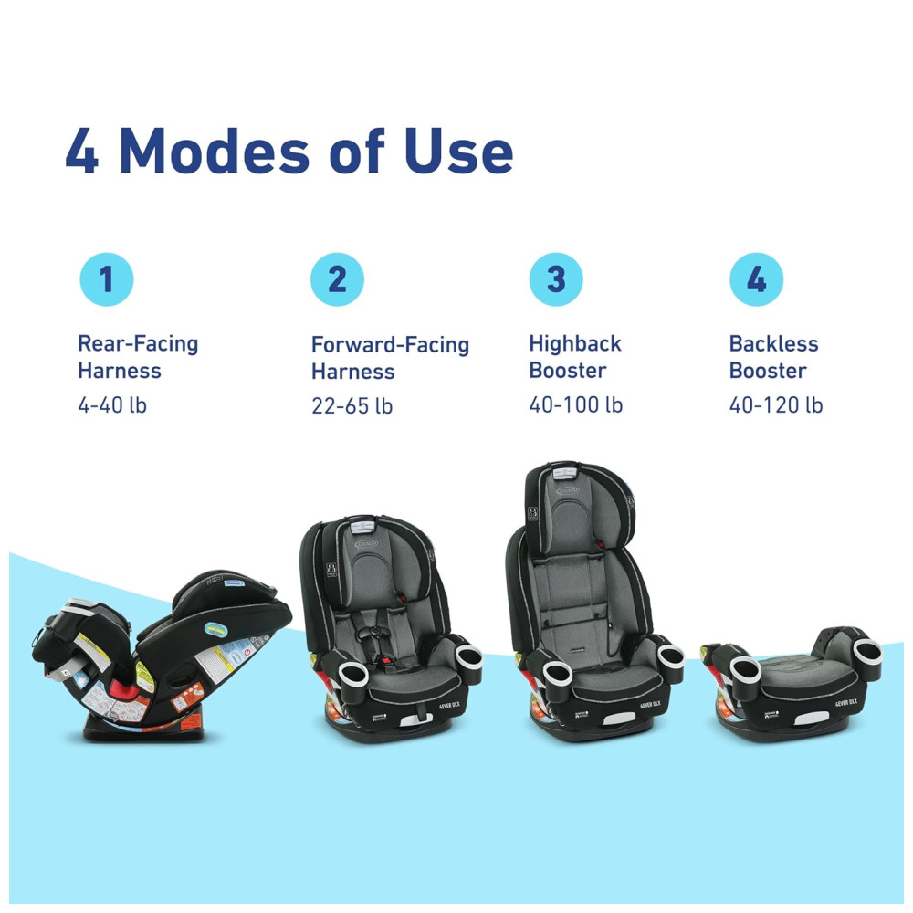 O assento para carro 4 em 1 oferece 10 anos de uso transforma se perfeitamente de assento de carro com arnês voltado para trás 1 a 18 kg, para assento de carro com arnês voltado para a frente 9 a 29 kg, para reforço de posicionamento com cinto traseiro alto 18 a 45 kg. para reforço de posicionamento de cinto sem encosto 18 a 54 kg.