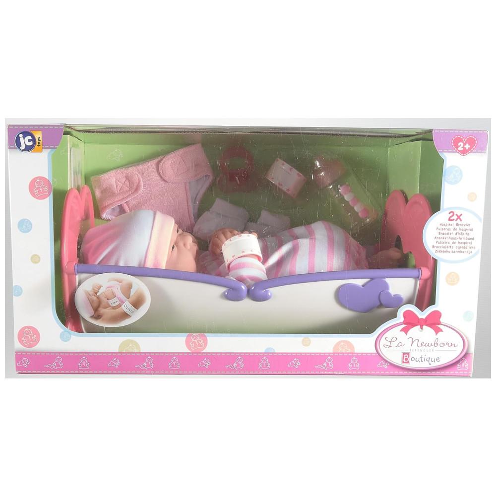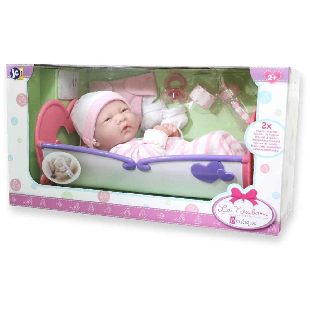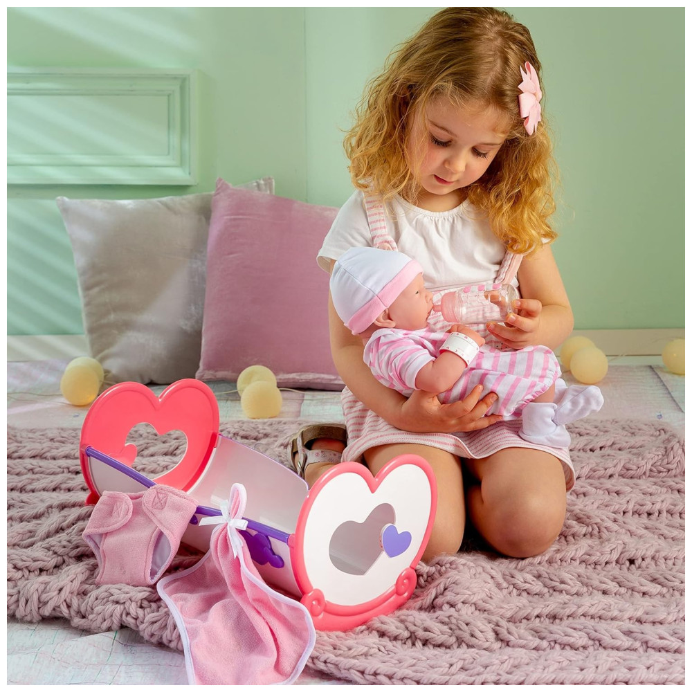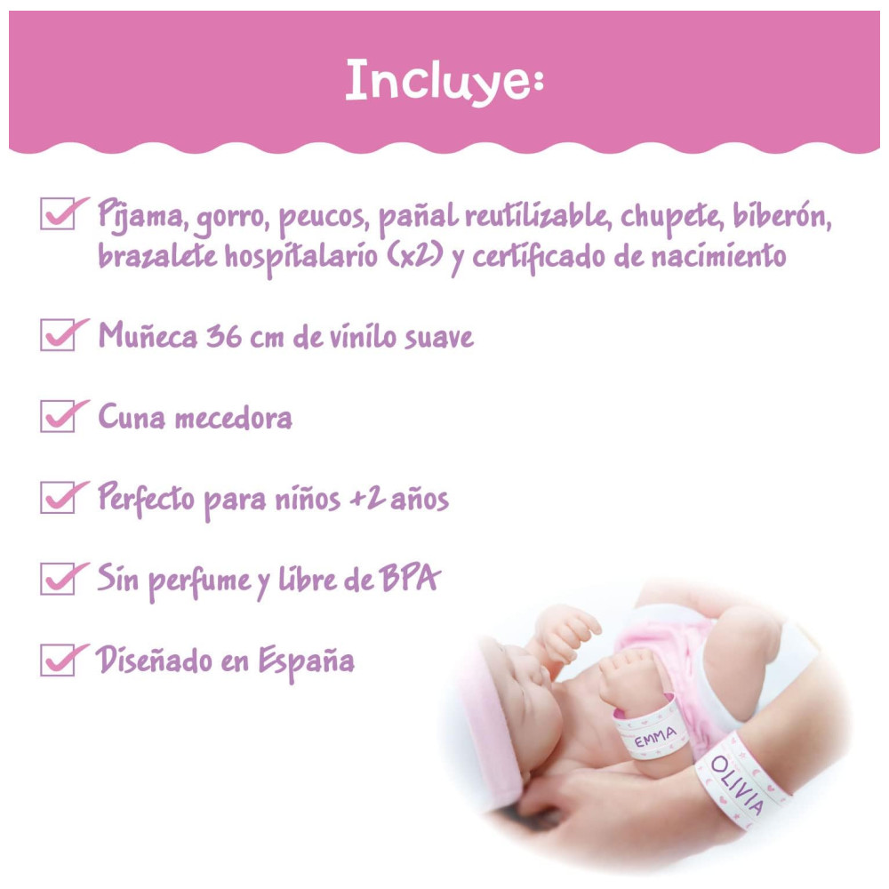 O Conjunto de Presente Deluxe de Berço de Balanço com 10 Peças La Newborn da JC Toys certamente será um sucesso com seu filho! Que criança resistiria à ideia de colocar seu bebê para dormir? Este conjunto acessível inclui um durável berço de balanço, chupeta, mamadeira, pulseiras hospitalares e muito mais. Mais importante ainda, inclui uma adorável boneca de 35 cm feita totalmente de vinil para facilitar a limpeza. Perfeito para aniversários, feriados ou simplesmente para diversão. Vestida com um conjunto de duas peças fofo, esta boneca é ideal para todo tipo de aventuras imaginárias. Com seus braços, pernas e cabeça móveis e expressão realista, estimulará a imaginação da criança. Ensine habilidades de cuidado e carinho às crianças com brincadeiras de faz de conta. Feita de vinil atóxico, livre de BPA, suave ao toque e durável por anos. À prova d’água para facilitar a limpeza. Fabricada pela JC Toys, uma fabricante premiada de bonecas com mais de 30 anos de experiência. Orgulhosamente projetada por Berenguer.