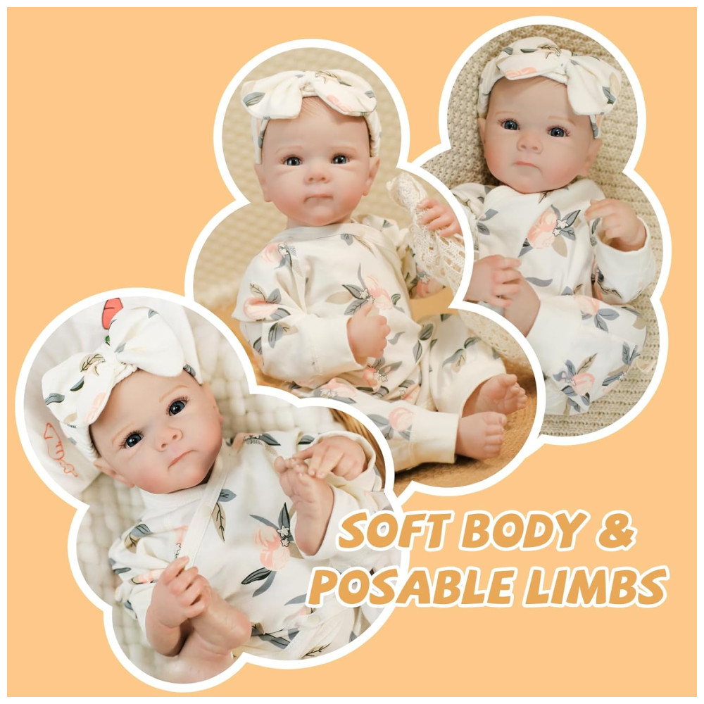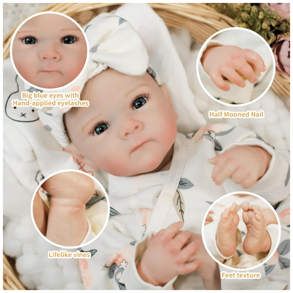 As bonecas bebê reborn pintadas à mão da Babeviimt possuem veias realistas, cabelo e sobrancelhas pintados à mão, e um belo blush nos dedos e nos pés enrugados. Com membros flexíveis, você pode posicionar a boneca como desejar. Tamanho de recém-nascido de 50 cm que veste roupas de bebê para 0-3 meses. Esta boneca de vinil macio de alta qualidade é segura, amigável à pele e fácil de limpar. Além disso, é um presente perfeito para desenvolver habilidades sociais e cognitivas.Inclui acessórios e caixa de presente.