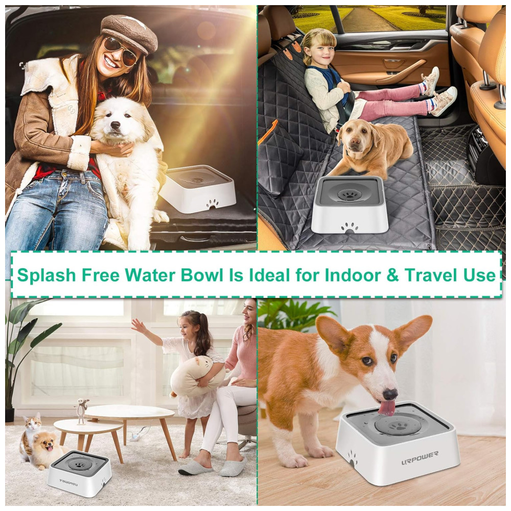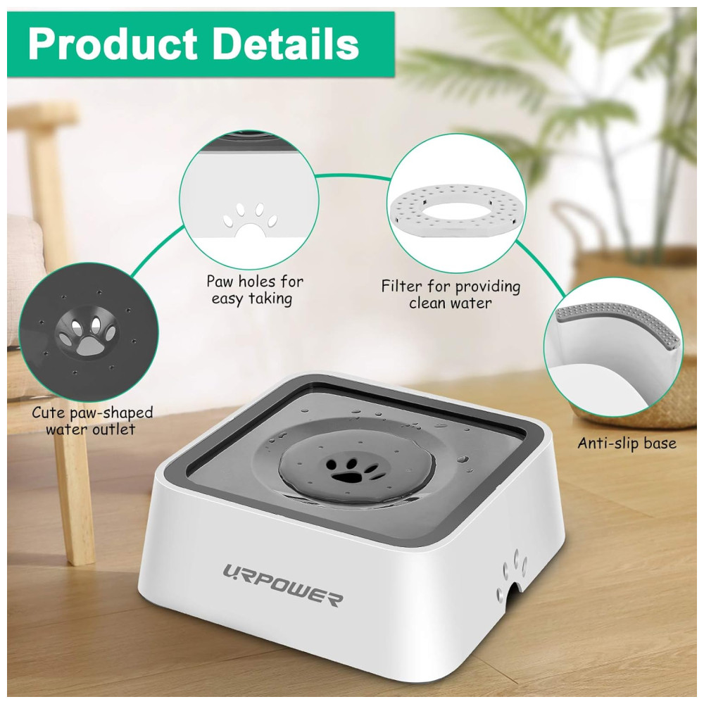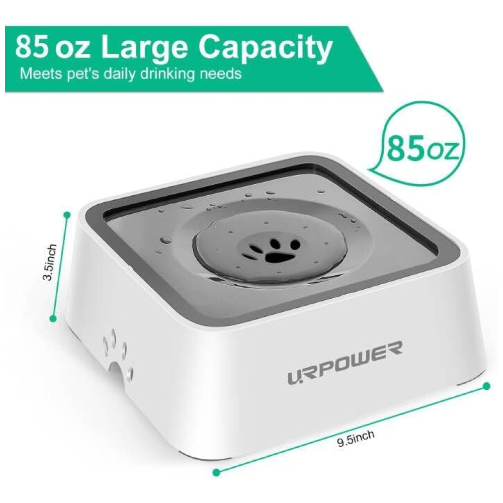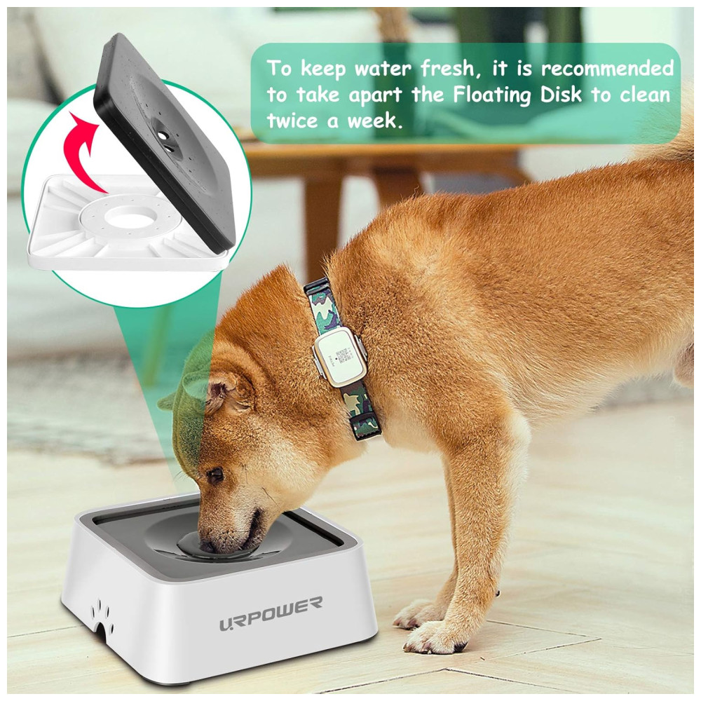 ALIMENTADOR DE ÁGUA LENTA Dotada de disco flutuante, a tigela de água para cães URPOWER diminui a velocidade de bebida do animal, assim, para manter o pelo do animal seco, também evita choques e respingos.