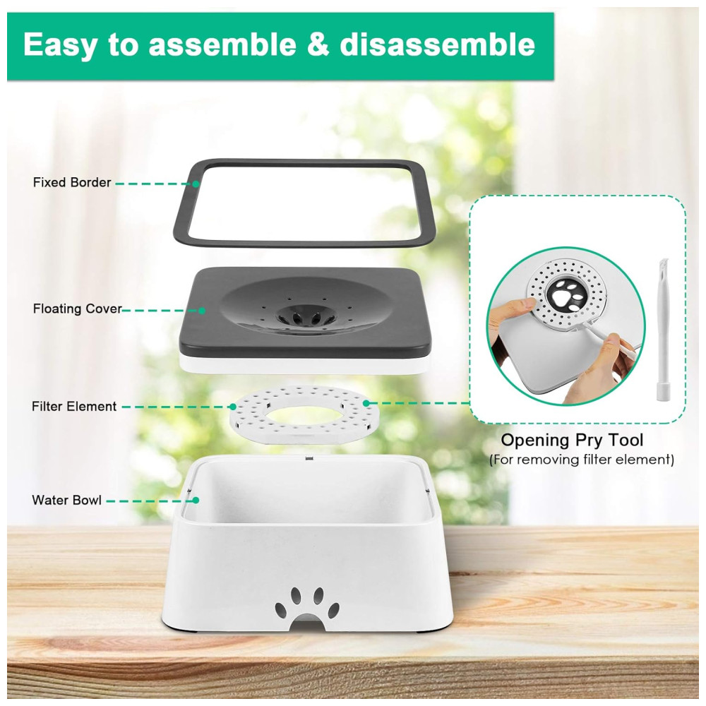 FÁCIL DE LIMPAR A borda livre de respingos, o disco flutuante e o elemento do filtro consistem na tigela de água do cachorro são removíveis, tornando o fácil de desmontar e limpar