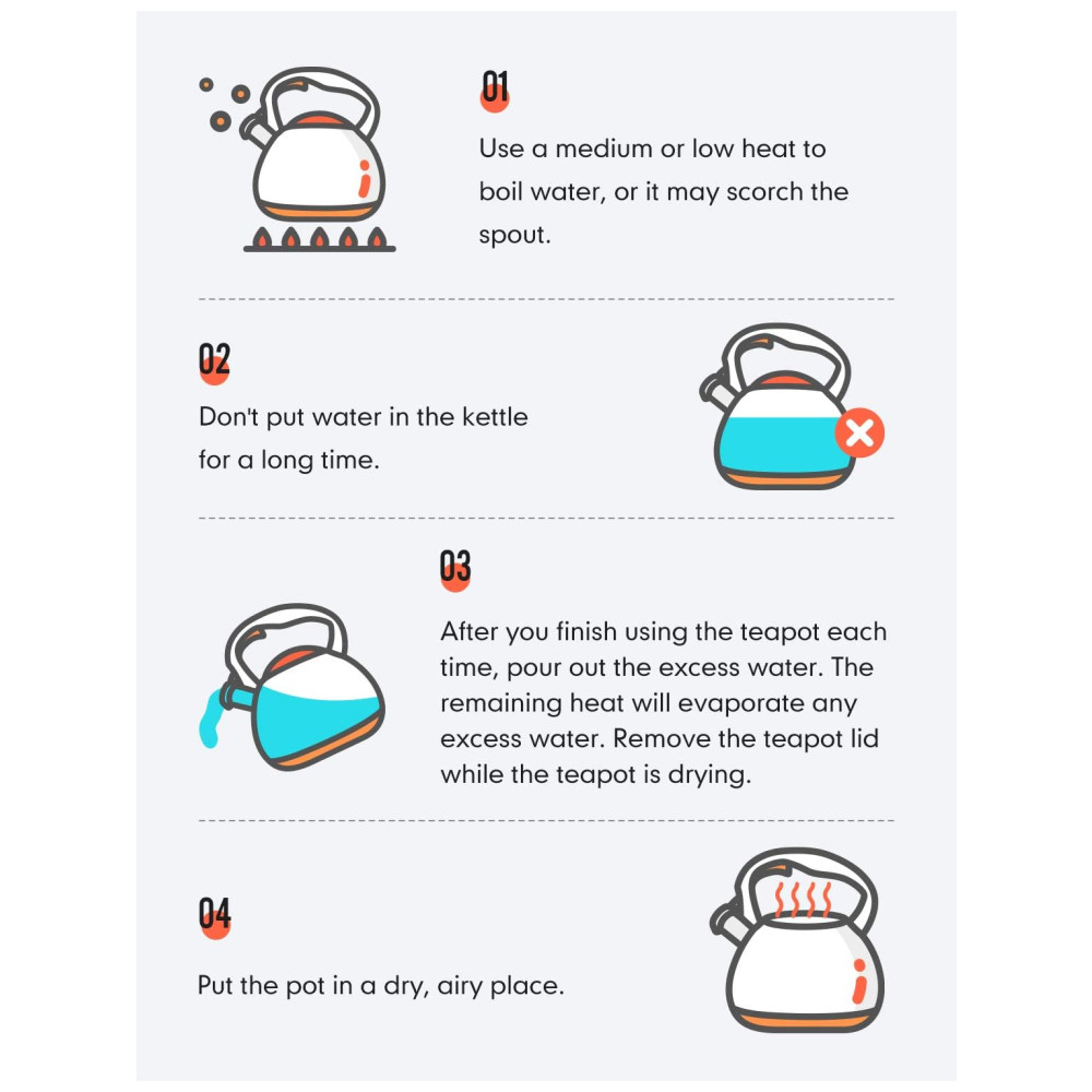 Som de assobio alto O assobio automático e alto chama sua atenção mesmo em um ambiente barulhento. Quando você se concentra em suas tarefas domésticas, filmes, música ou qualquer outra coisa, o bule irá lembrá lo com um apito após ferver a água. Para evitar que se esqueça de desligar e secar a água. Dica basta encher 80 da capacidade para que a chaleira de água possa apitar quando a água estiver fervendo.