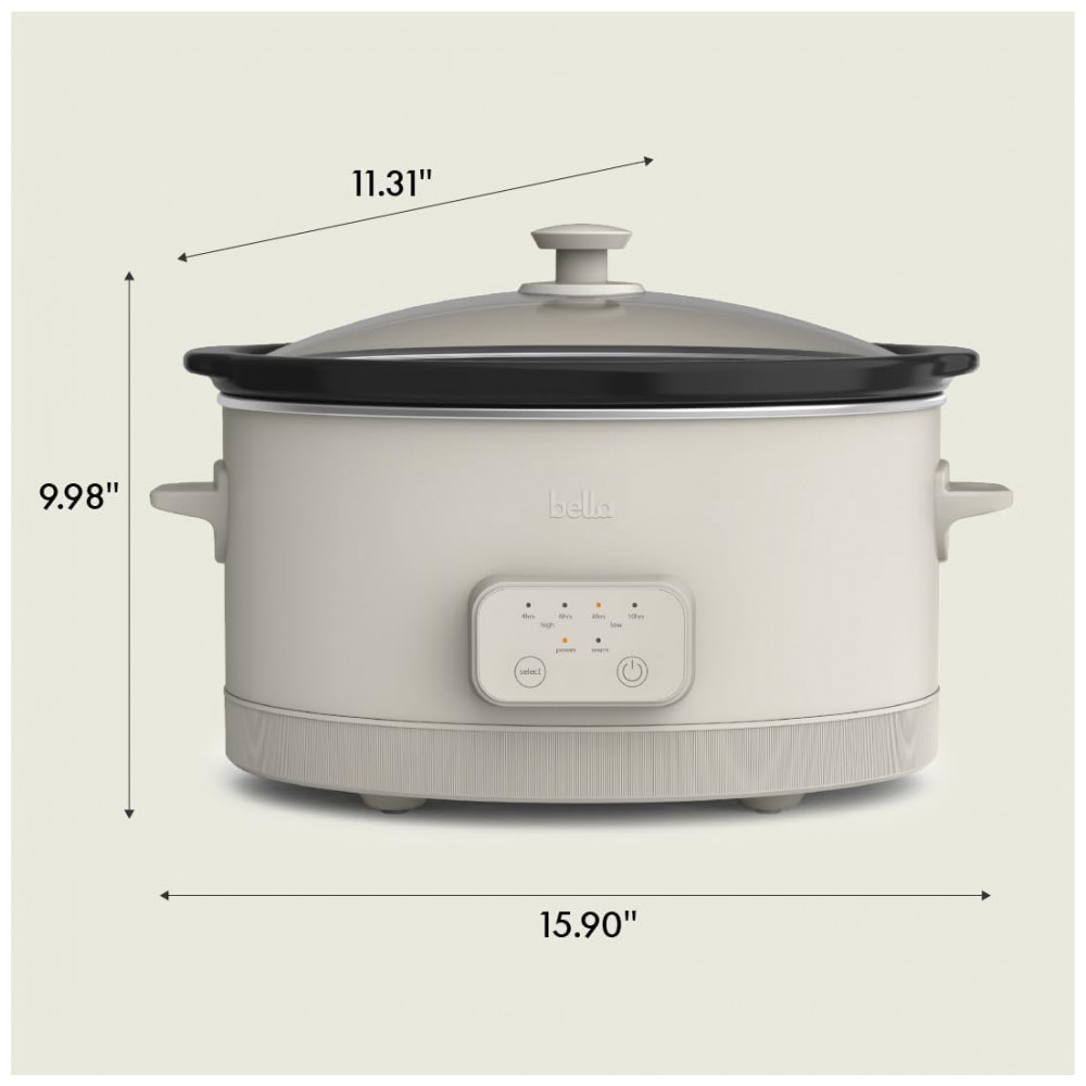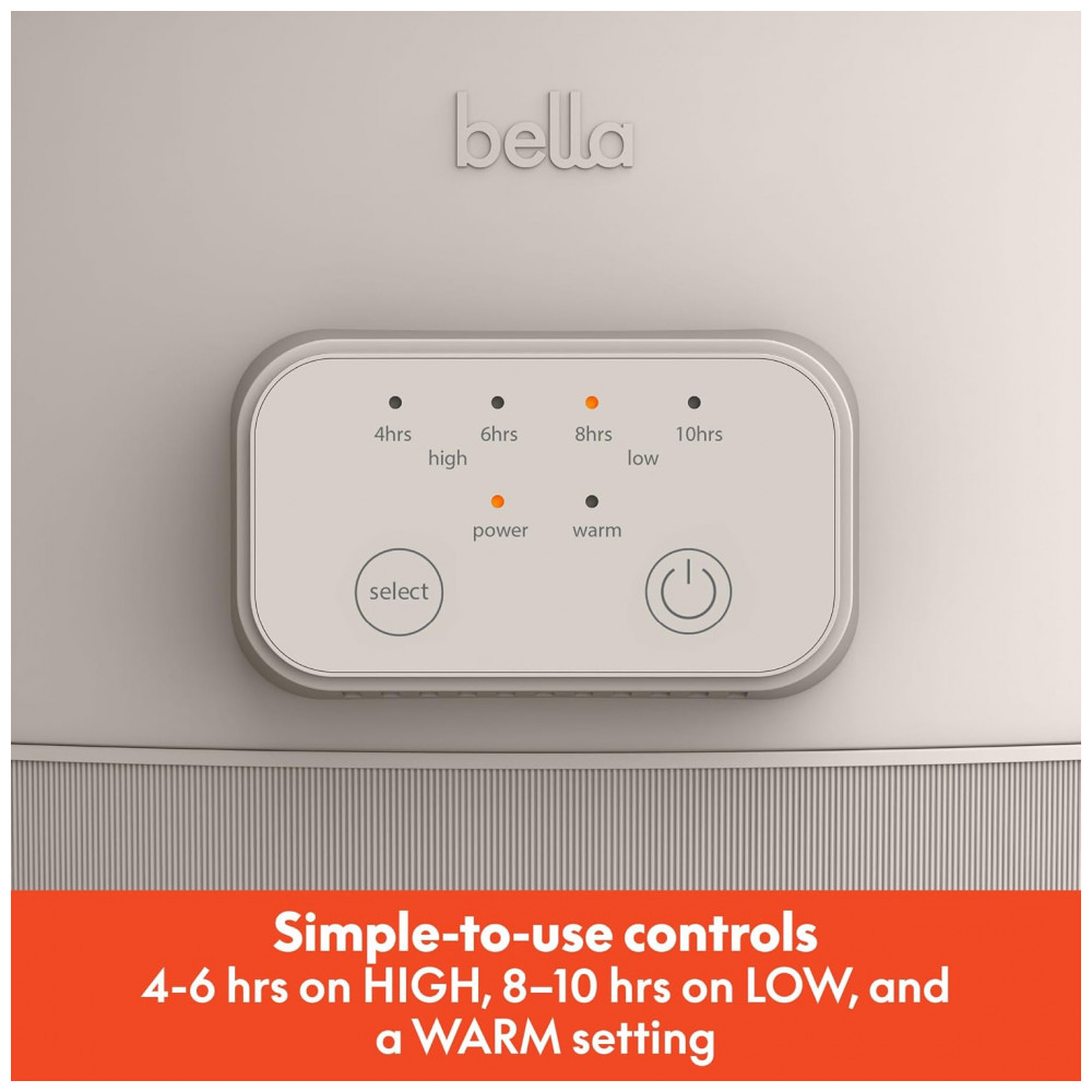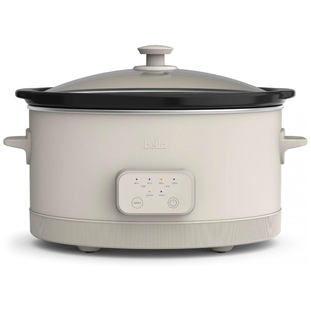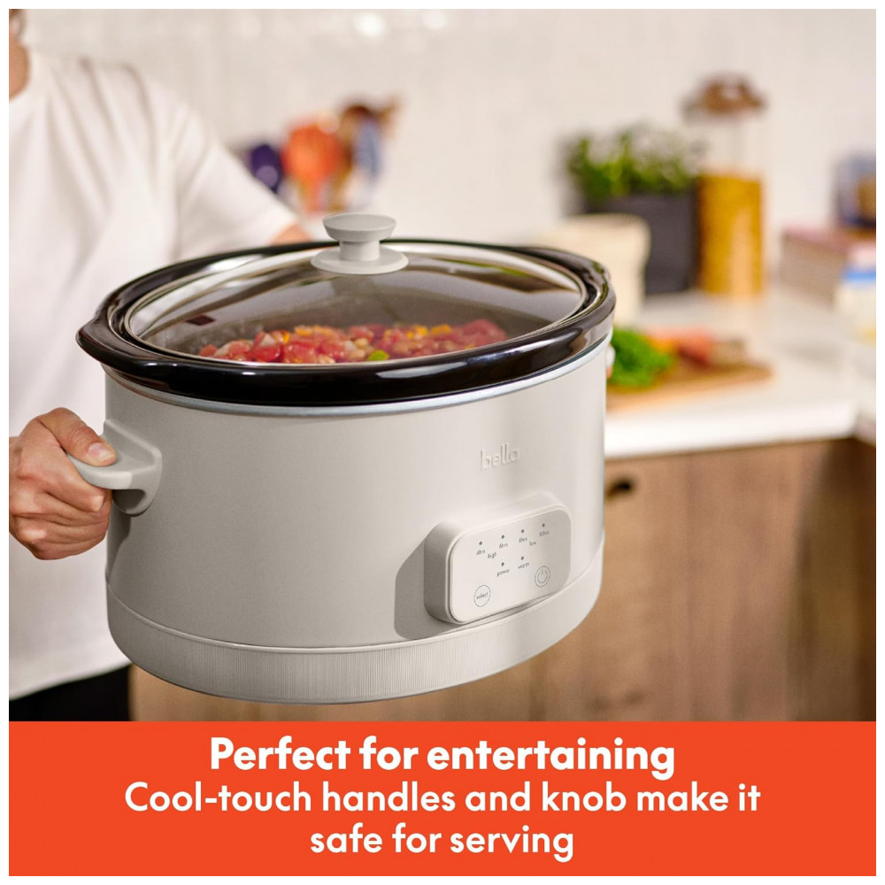 A panela elétrica de cozimento lento programável BELLA 5,7L Oatmilk permite preparar grandes volumes de sopas, ensopados e assados com três níveis de temperatura e tempos programáveis de 4, 6, 8 ou 10 horas. A cuba em stoneware com revestimento cerâmico antiaderente EverGood, livre de PFAS, PFOA, PTFE, chumbo e cádmio, é removível, assim como a tampa de vidro temperado, facilitando a limpeza e o uso diário.