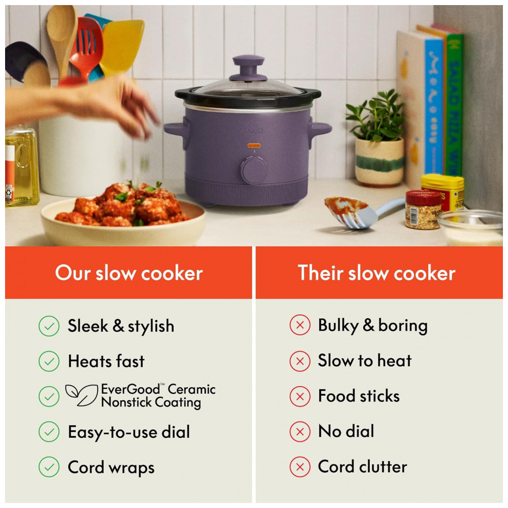 Adicione um toque de charme à sua cozinha com a Slow Cooker BELLA de 1,4 litros, perfeita para jantares íntimos e encontros pequenos que mais importam. Ideal para duas pessoas, esta panela elétrica é sua aliada para uma grande variedade de receitas de cozimento lento — desde ensopados robustos e assados macios até fondue de chocolate e molhos saborosos. Com controles manuais simples e três configurações de calor — baixo, alto e aquecimento — você pode preparar suas refeições lentamente até atingir a perfeição, fazendo de cada mordida um momento especial. Este aparelho portátil não é apenas funcional, mas também um complemento encantador para a decoração da sua cozinha. Disponível em cinco cores exclusivas BELLA — Oatmilk, Surf, Blossom, Plum (Ameixa) e Seaglass — ele traz personalidade e estilo ao seu ambiente. Também é uma excelente opção de presente para diversas ocasiões, como inaugurações e casamentos, combinando praticidade e design sofisticado. A panela de cerâmica resistente e antiaderente, livre de PFAS, PFOA, PTFE, chumbo e cádmio, oferece uma superfície que facilita a liberação dos alimentos e limpeza rápida. Além disso, a tampa de vidro temperado permite acompanhar o preparo sem abrir a panela, enquanto as alças com toque frio garantem manuseio seguro. O sistema de enrolamento do cabo mantém sua bancada organizada, evitando bagunça e facilitando o armazenamento. Seja para preparar sopas, pratos reconfortantes ou sobremesas, esta slow cooker elétrica é sua chave para a criatividade culinária simples e prazerosa.