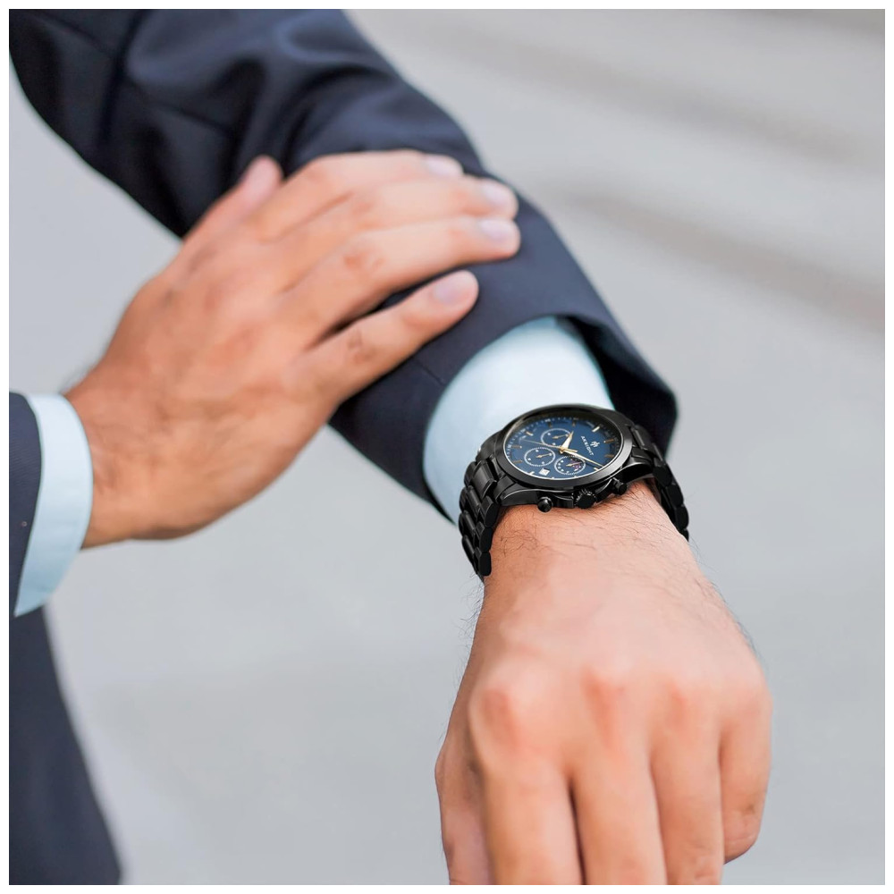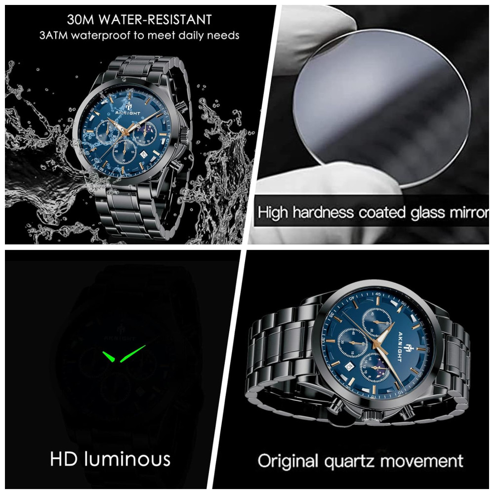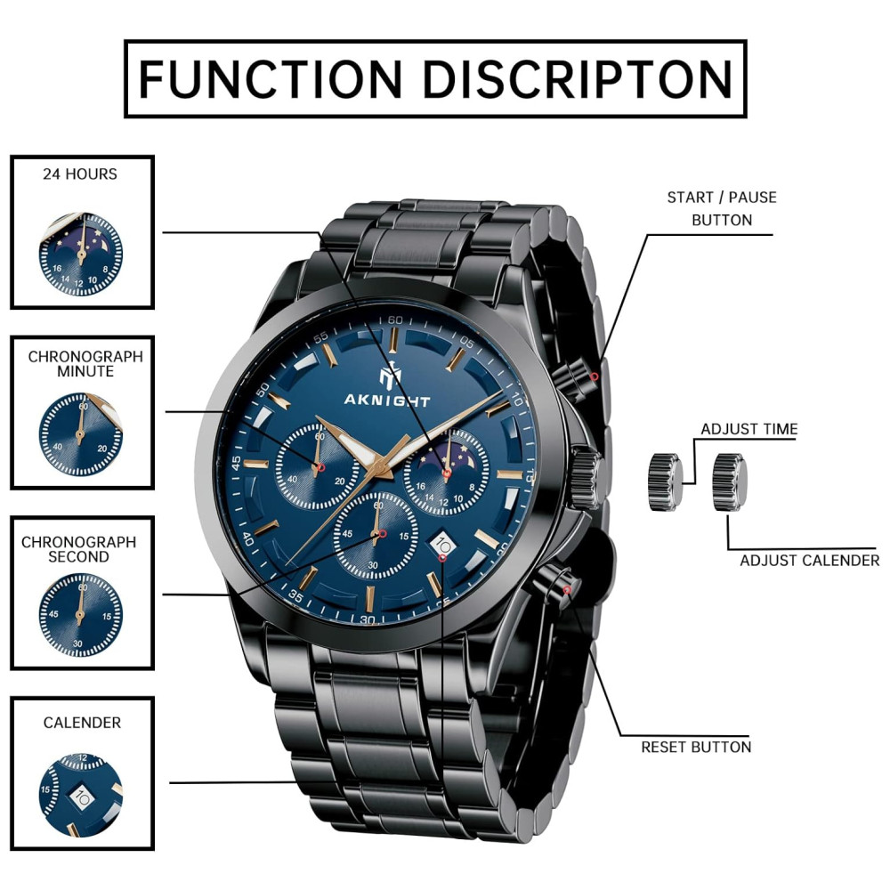RELÓGIOS DE QUALIDADE 100 PREMIUM Estamos fornecendo relógios clássicos para homens com movimento de quartzo de qualidade premium 100. Nossos relógios são incrivelmente duráveis e podem durar toda a vida quando mantidos adequadamente. Relógio cronógrafo multifuncional com três submostradores para segundos, minutos e horas.
