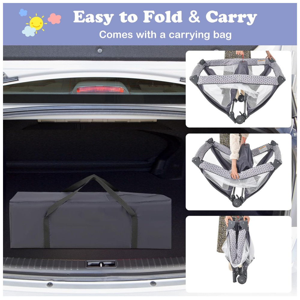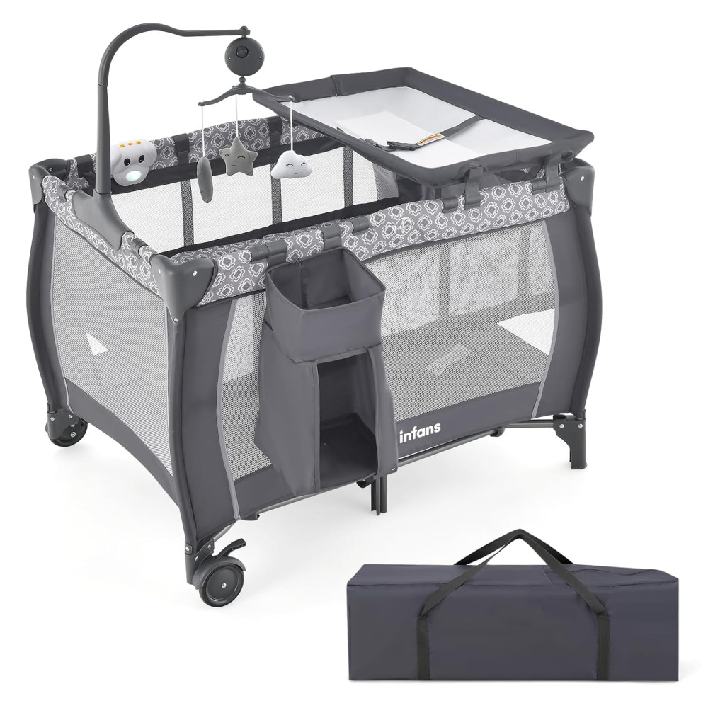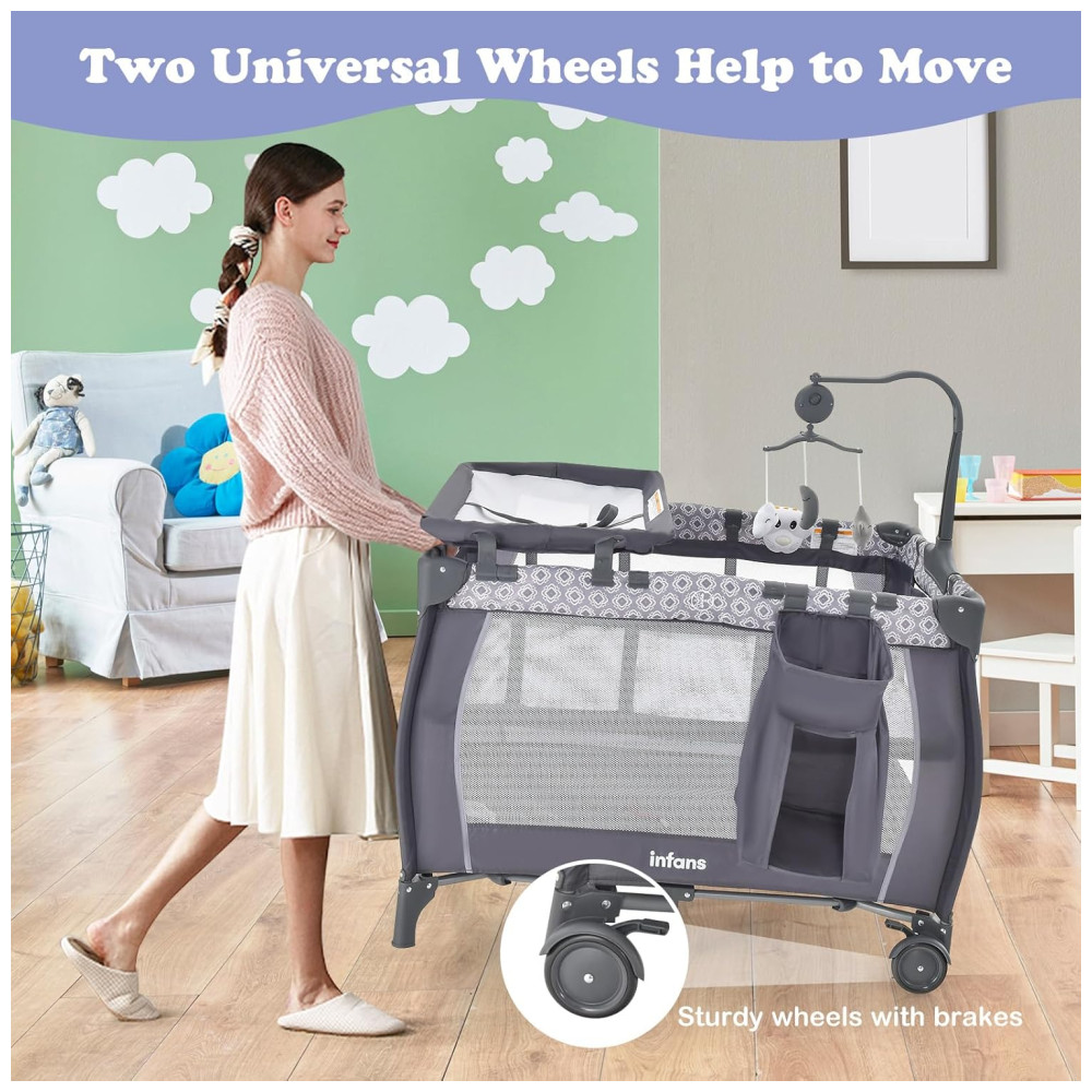 Berço Cercado Portátil 3 em 1 Dobrável com Colchão Removível Trocador Móbile Bolsa de Transporte e 2 Rodas INFANS Cinza