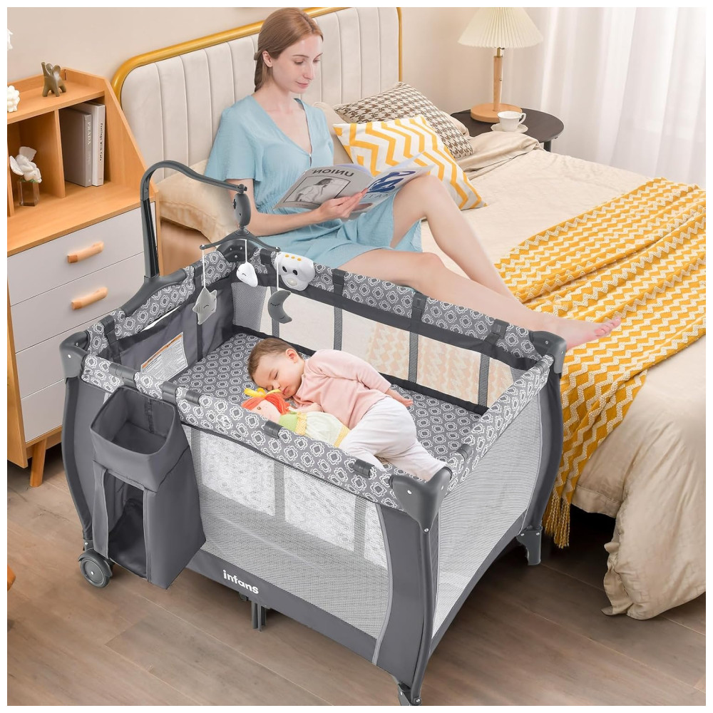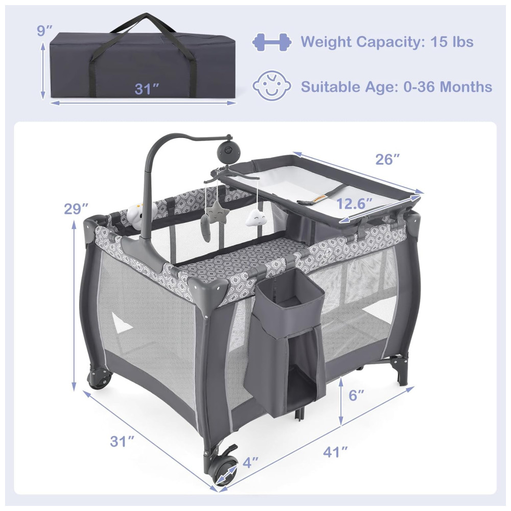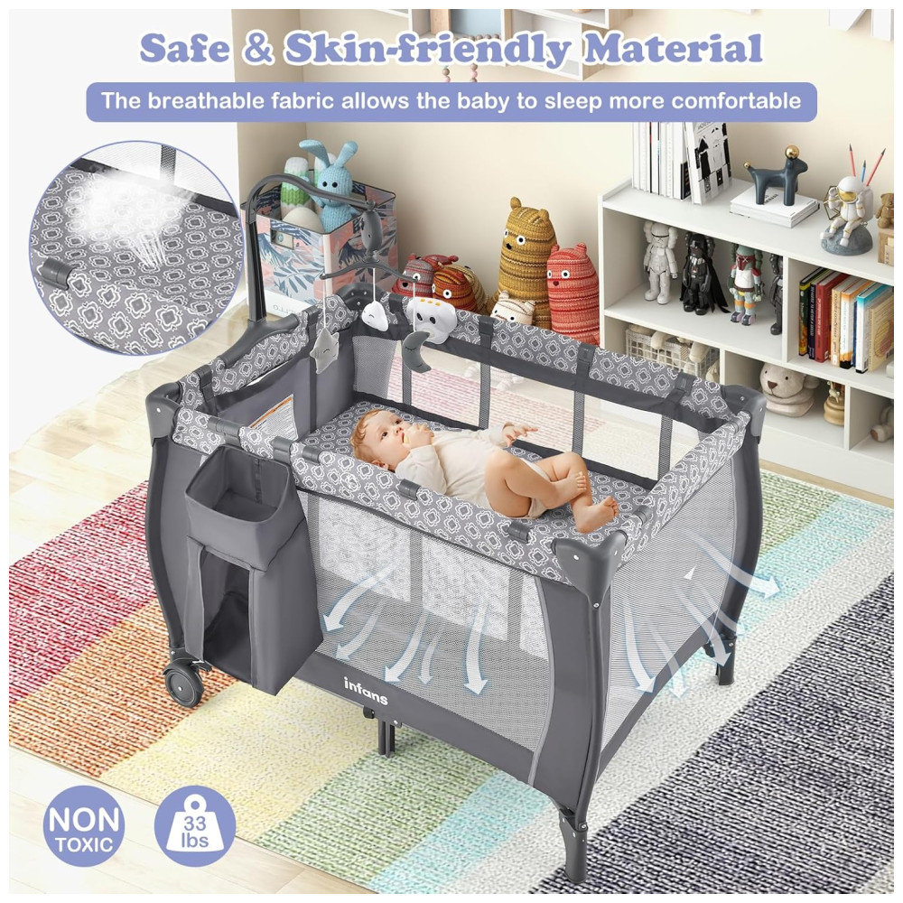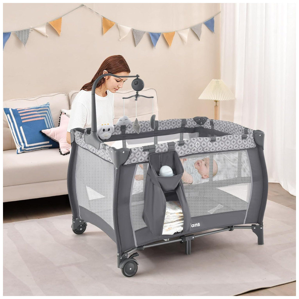Berço Cercado Portátil 3 em 1 Dobrável com Colchão Removível Trocador Móbile Bolsa de Transporte e 2 Rodas INFANS Cinza