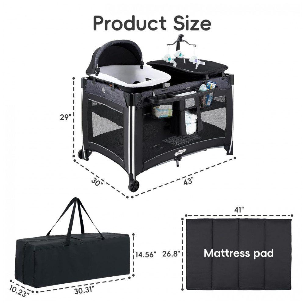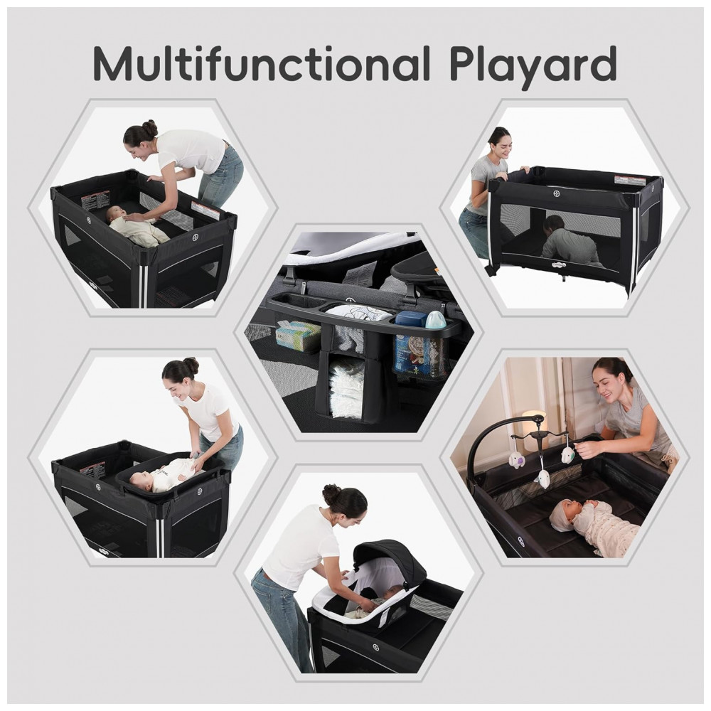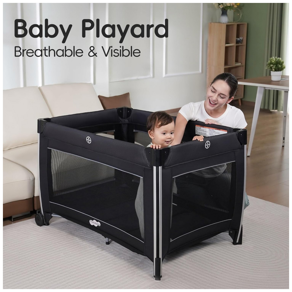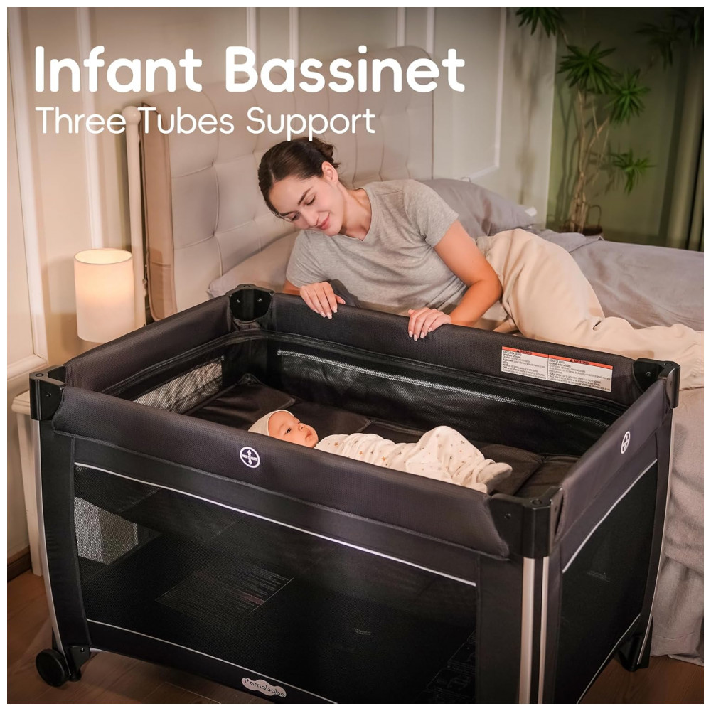 Berço Cercado Portátil 4 em 1 com Colchão Trocador para Recém Nascido e Espaçoso Pamo Babe Preto