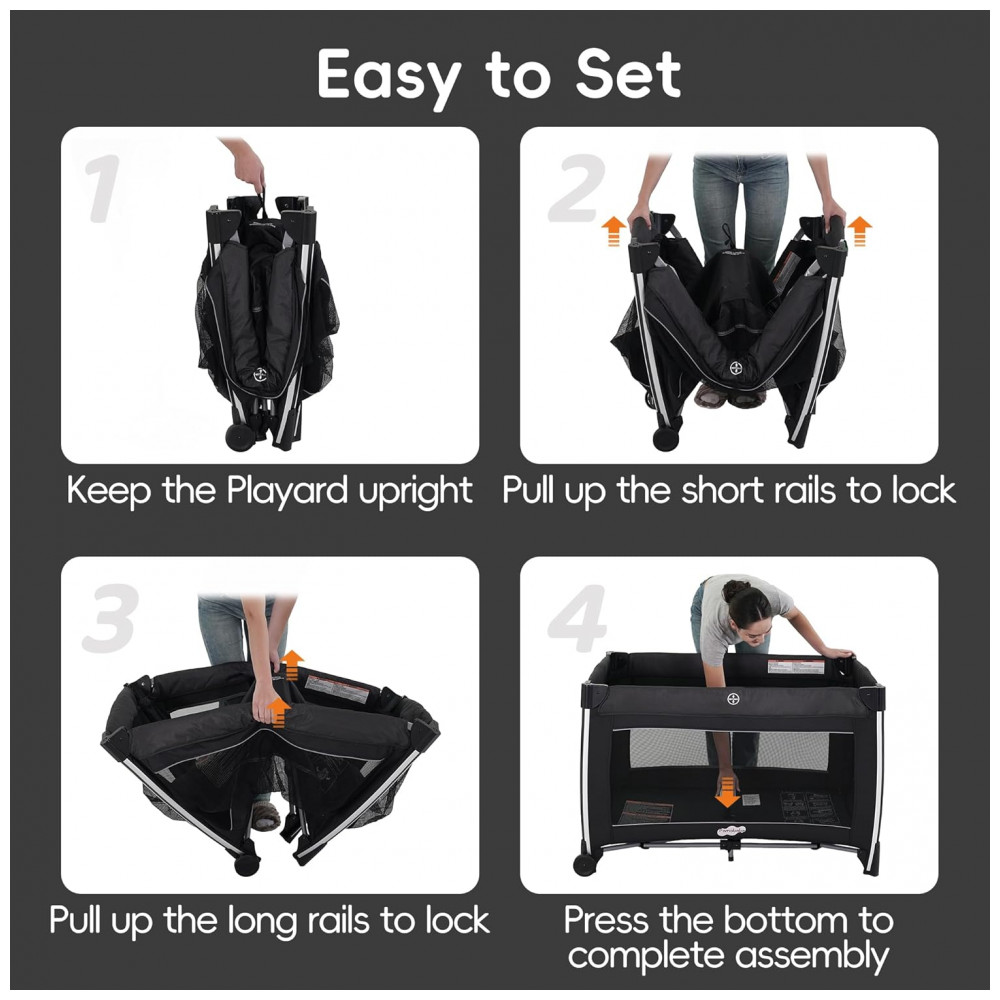 Fácil de montar Montagem super fácil. Muito funcional. A cama de brincar pode ser facilmente montada sem ferramentas. O espaço amplo permite que os bebês pratiquem ficar em pé e brincar após retirar o berço.