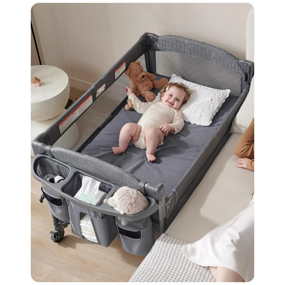 O berço de cabeceira AirClub para bebê possui um lado retrátil que pode ser levantado ou abaixado para fornecer acesso direto ao seu bebê para alimentação noturna, conforto e troca de fraldas, ideal para mães que passaram por cesariana.