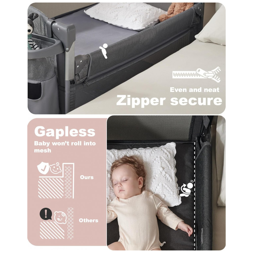 Ao baixar o lado retrátil do berço de cabeceira AirClub, ele pode ser convertido de berço para berço de cabeceira. No modo berço, seu bebê fica e cercado por uma malha respirável, permitindo que você faça outras atividades à vontade. Com o design do zíper na lateral, você pode mudar para o modo de dormir de cabeceira com liberdade e facilidade para amamentar ou alimentar seu bebê durante a noite, proporcionando conforto e proximidade.