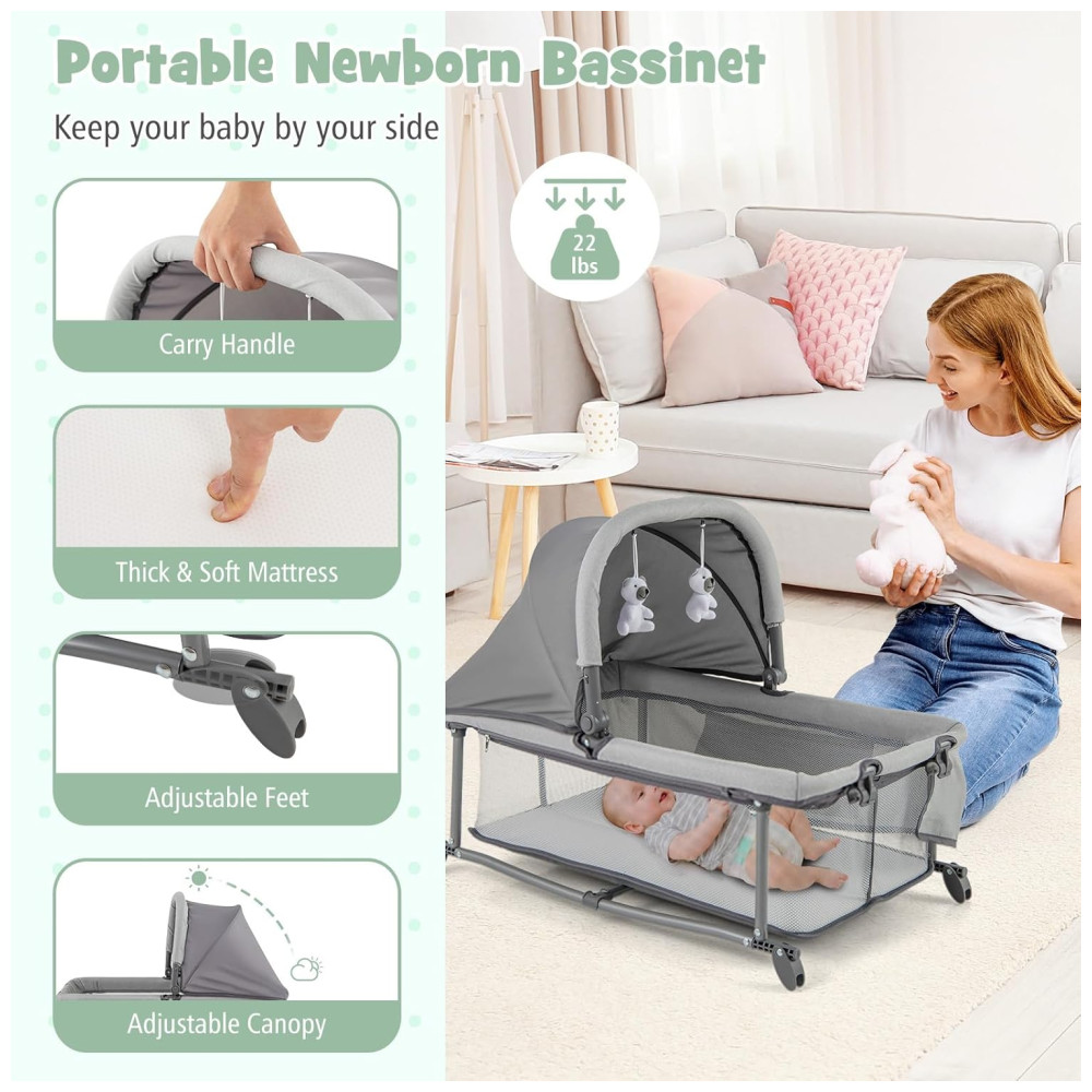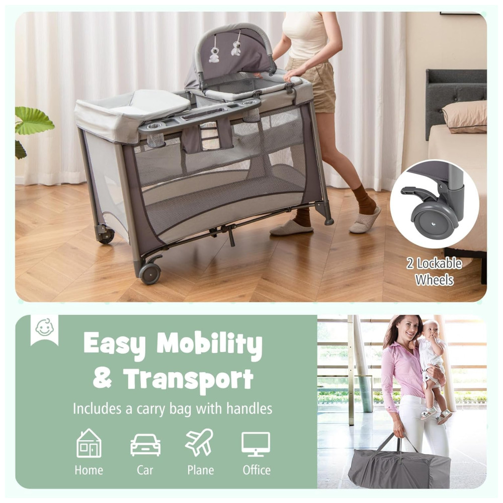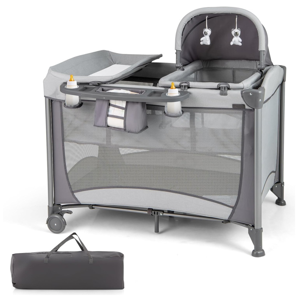 Berço Cercado Portátil 4 em 1 com Trocador Removível Cesta de Fraldas e Bolsa de Transporte HONEY JOY Cinza Escuro